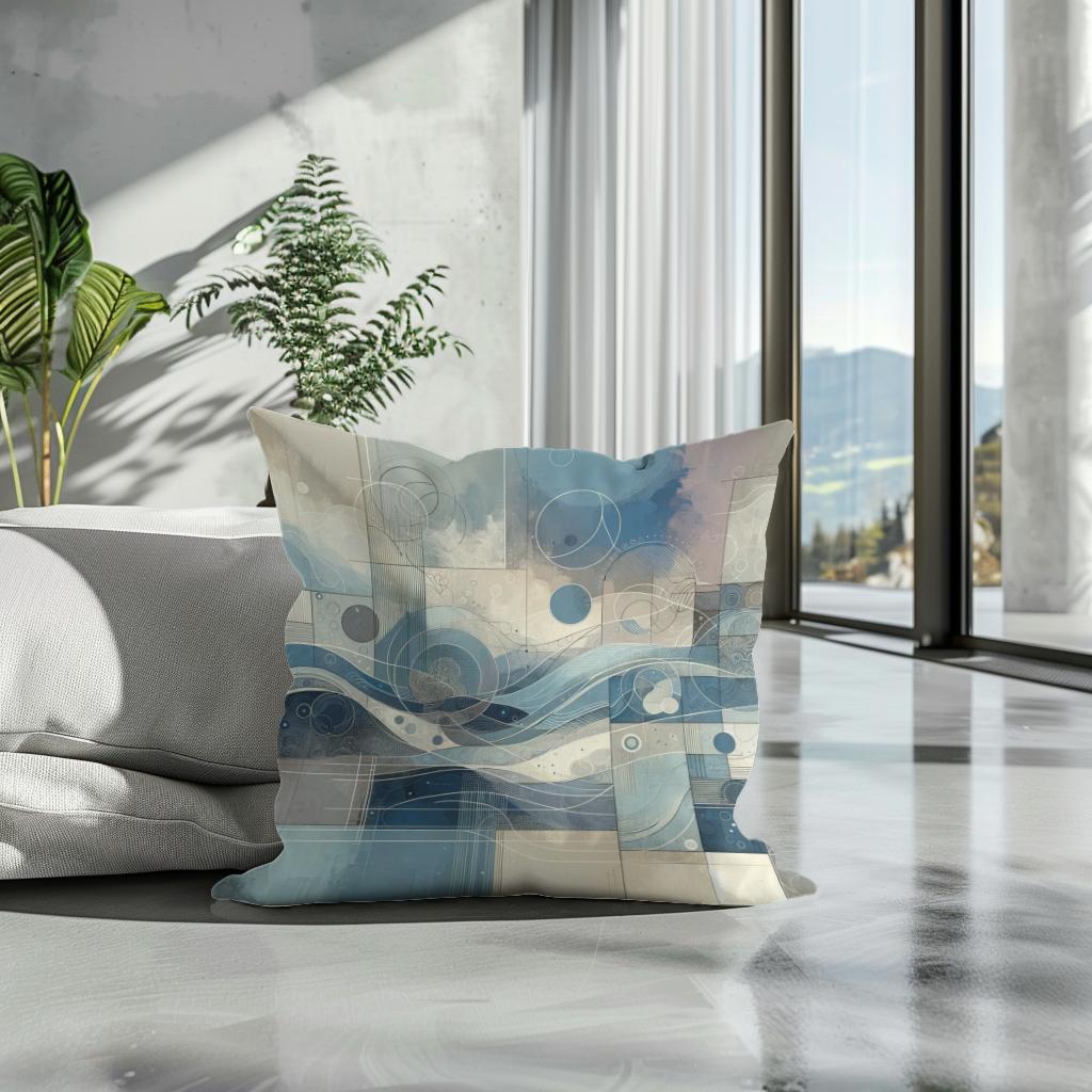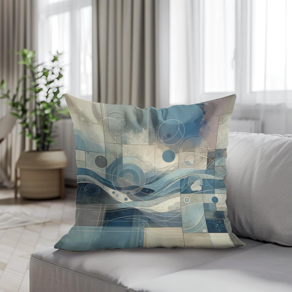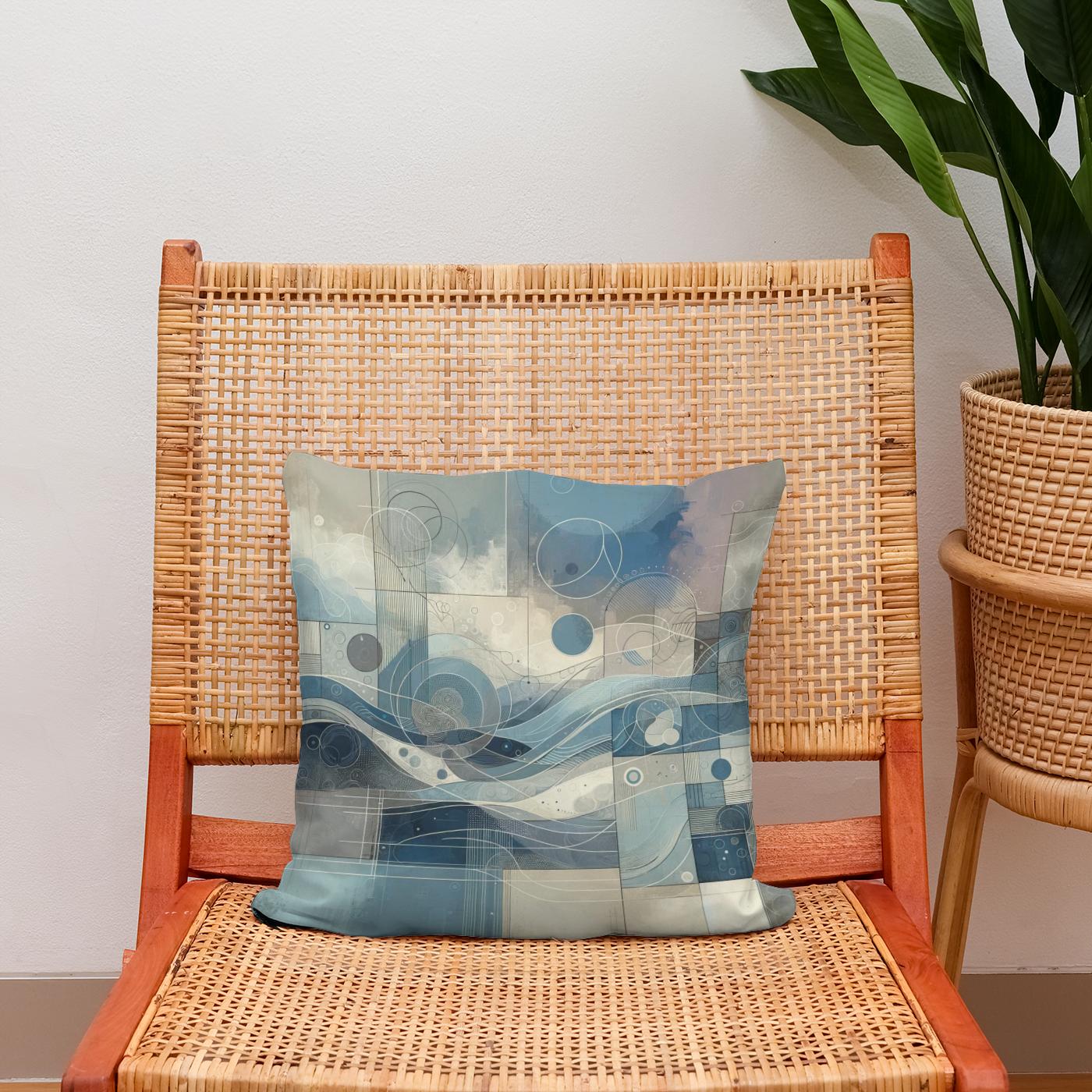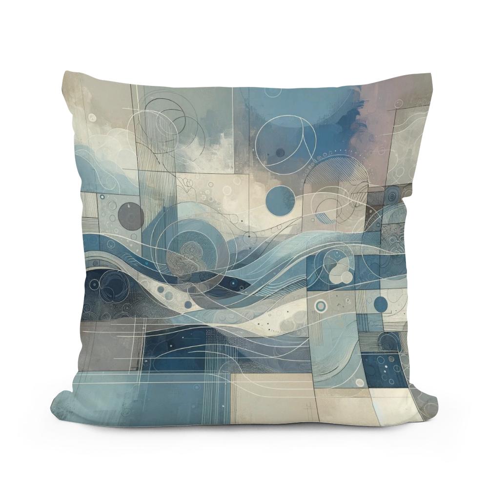 Elevate your living space with this stylish cotton cushion, featuring a modern abstract print in soothing blues and greys. The design blends flowing, wave-like forms with geometric circles and lines, creating a harmonious yet dynamic visual. Soft muted tones and intricate detailing make this cushion perfect for adding a touch of contemporary elegance to any room. Ideal for those who appreciate art and style in everyday comforts.