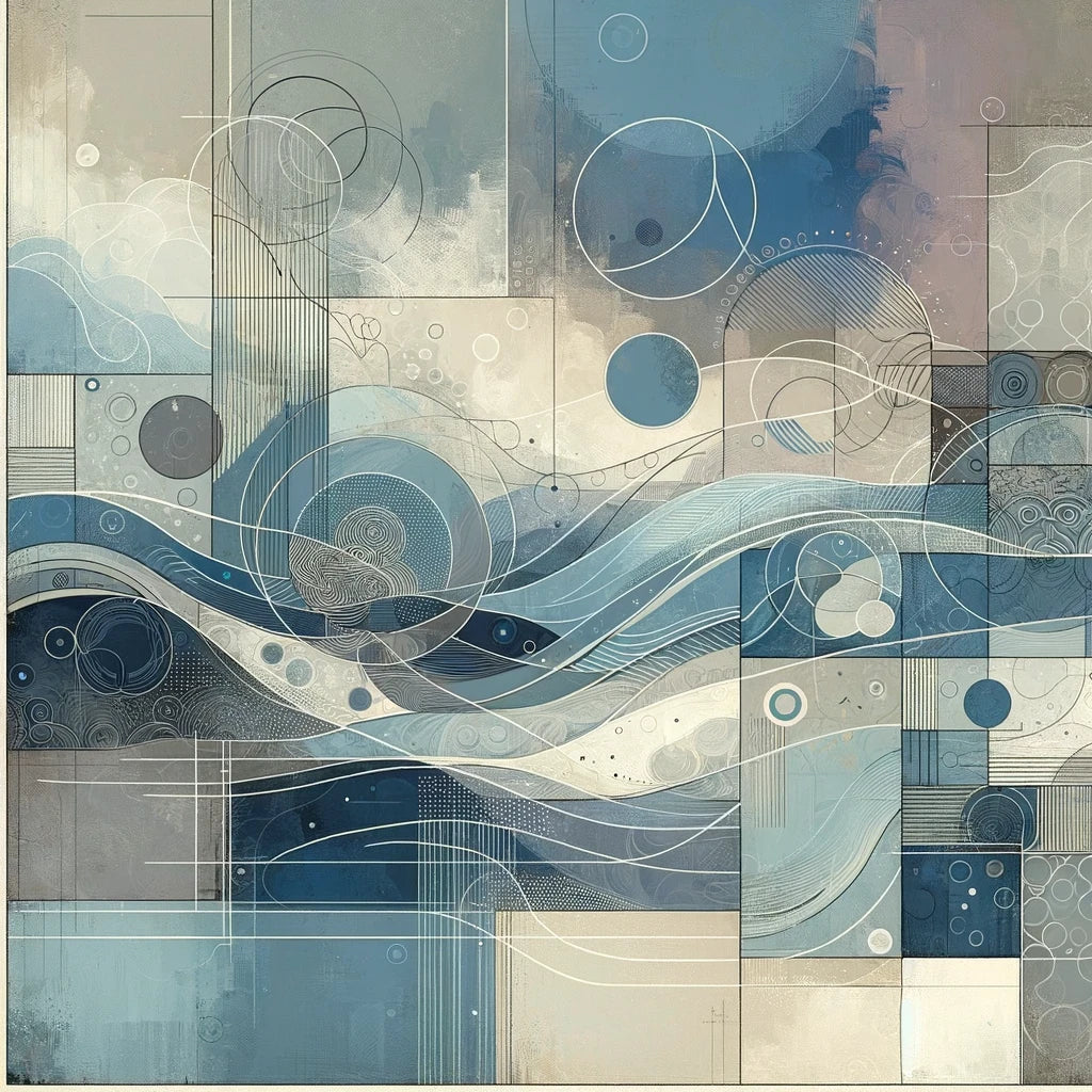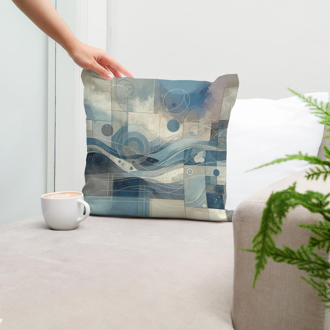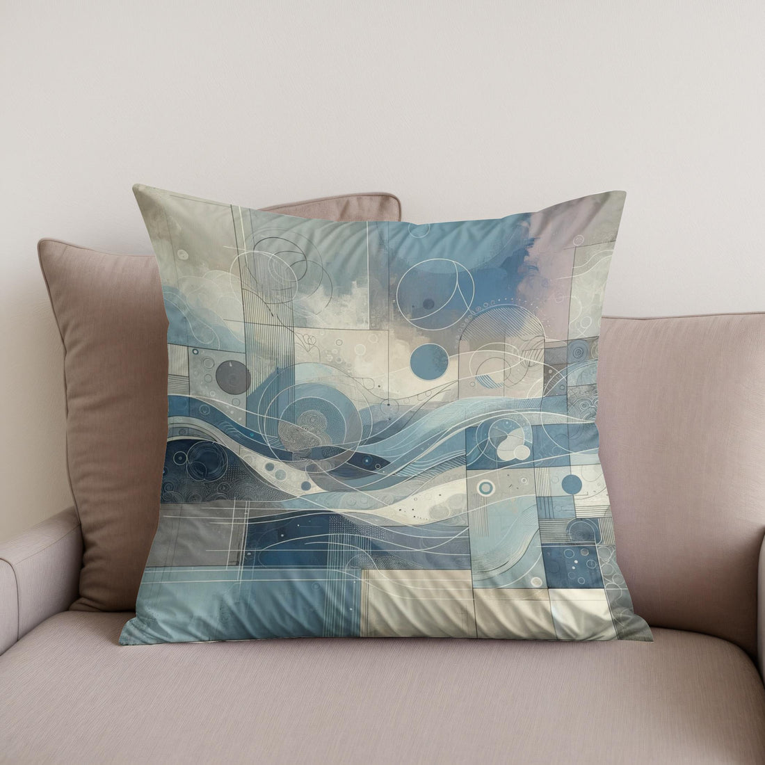 Elevate your living space with this stylish cotton cushion, featuring a modern abstract print in soothing blues and greys. The design blends flowing, wave-like forms with geometric circles and lines, creating a harmonious yet dynamic visual. Soft muted tones and intricate detailing make this cushion perfect for adding a touch of contemporary elegance to any room. Ideal for those who appreciate art and style in everyday comforts.
