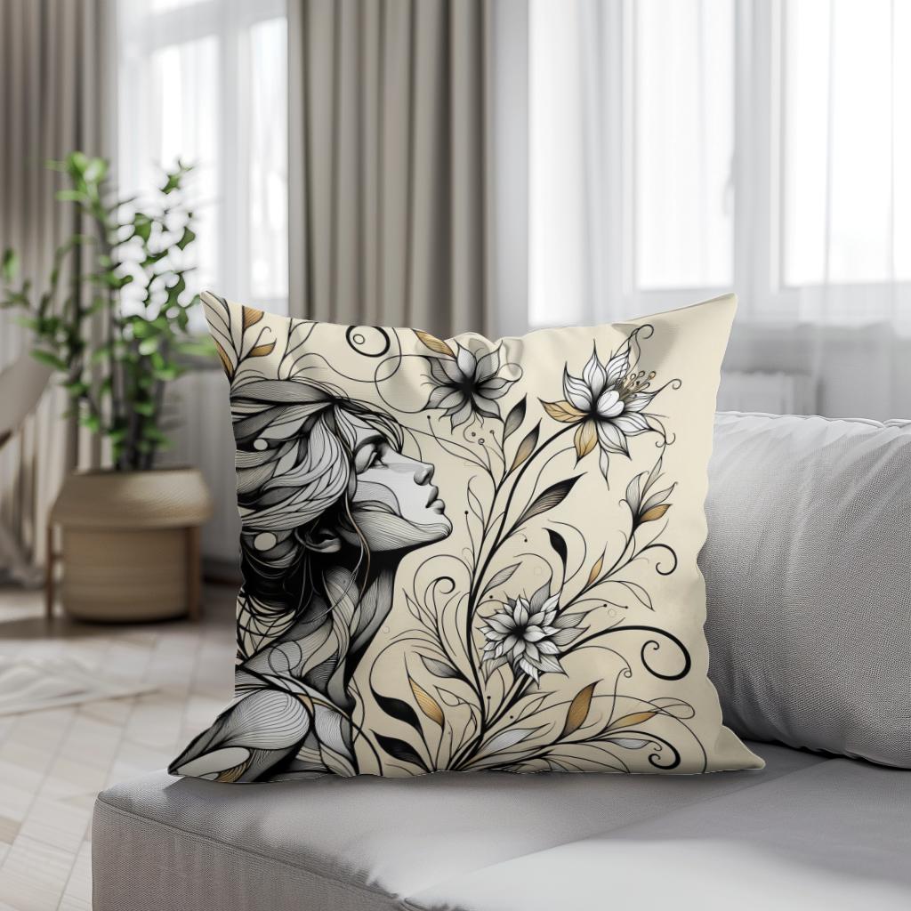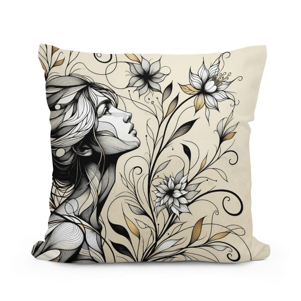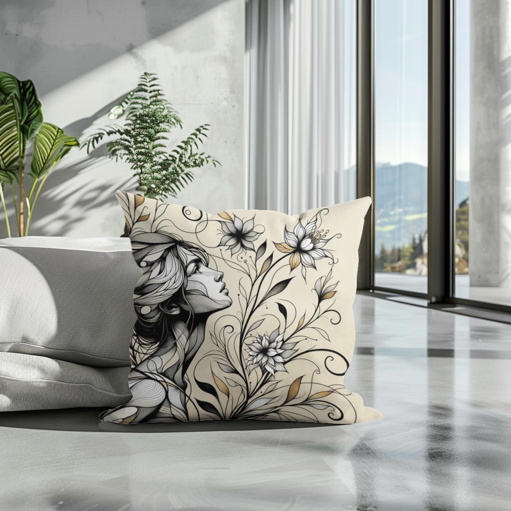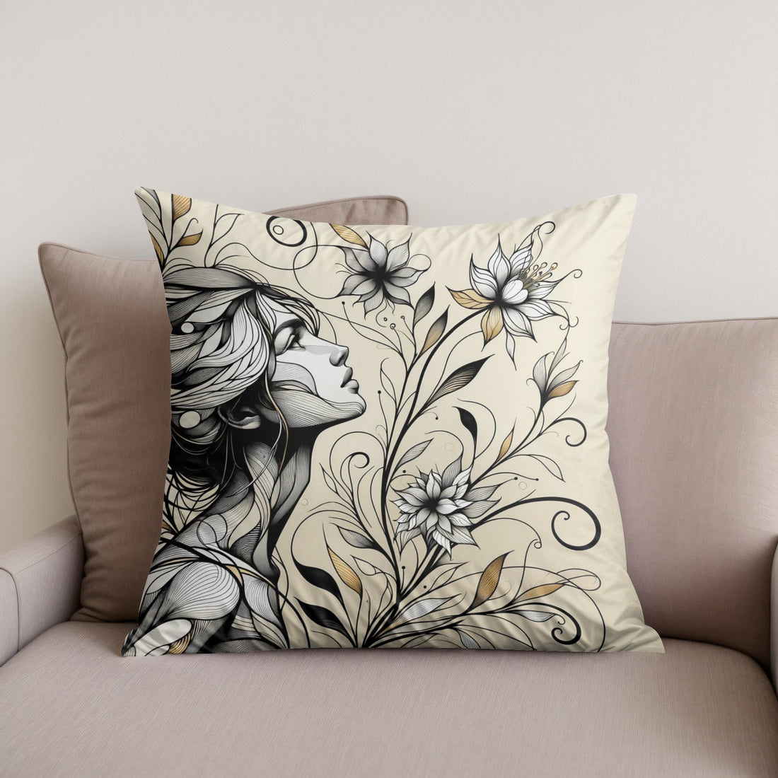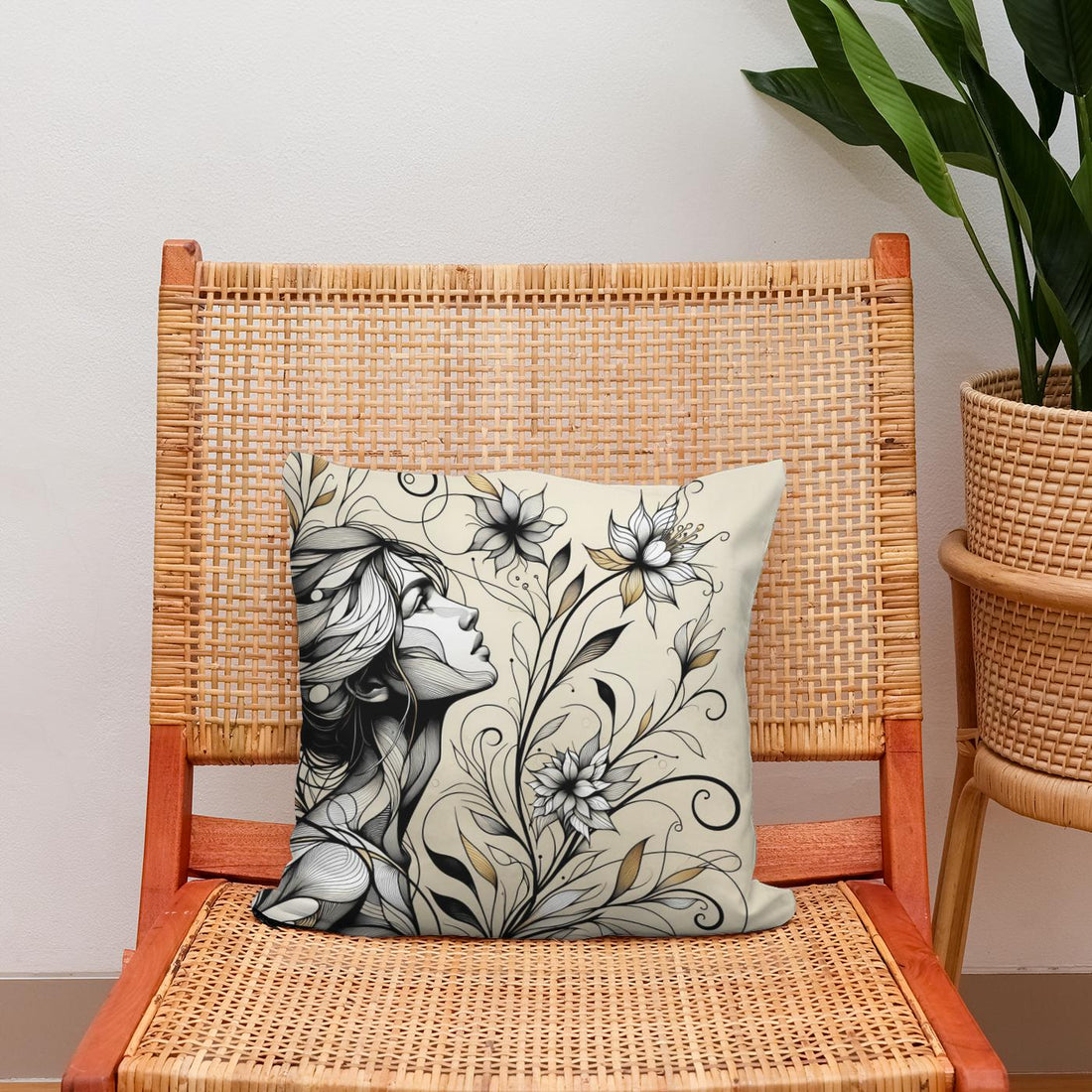 Adorn your living space with this exquisite cotton cushion, featuring a bewitching monochrome design of a graceful feminine profile entwined with elegant floral motifs. The intricate line art and swirls evoke a sense of delicate beauty, making it a sophisticated choice for any modern décor. This cushion captures the enchantment of nature intertwined with human allure, rendered in striking black and white with subtle golden accents. A splendid blend of art and comfort!