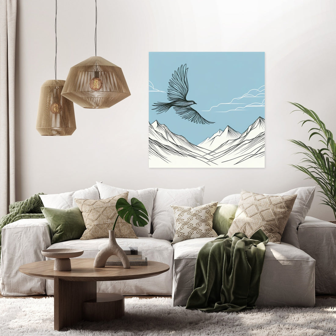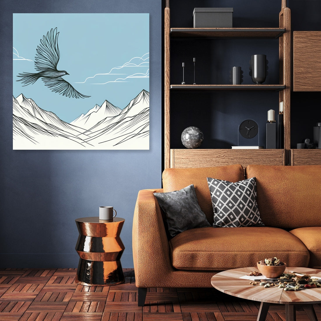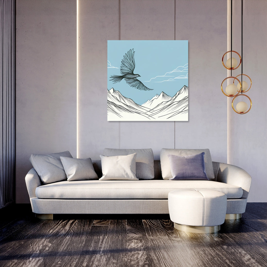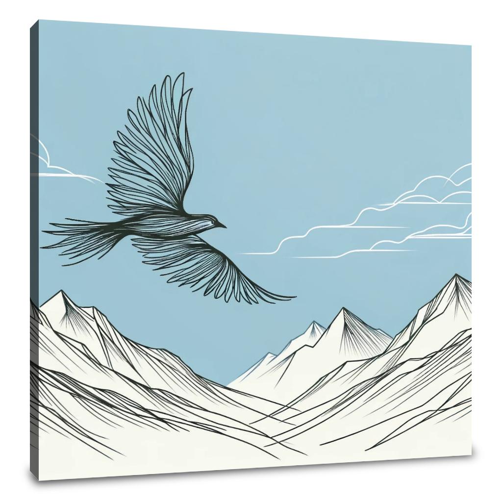 Elevate your space with the "Soaring Spirit Canvas," an artwork that captures the essence of freedom and aspiration. This piece features a bird gracefully soaring over majestic mountains, its path rendered in sleek, flowing lines against a serene sky-blue backdrop. The minimalist yet expressive design symbolizes the limitless possibilities and the spirit of liberty. Ideal for anyone seeking a visual representation of hope and boundless potential, this canvas adds an uplifting and inspirational touch to any room, inviting viewers to dream and aspire.