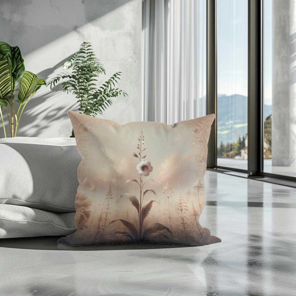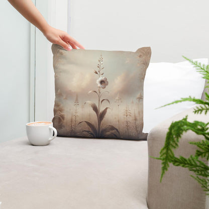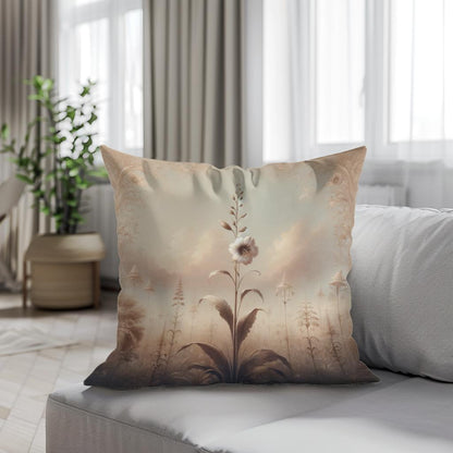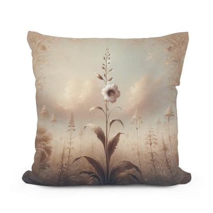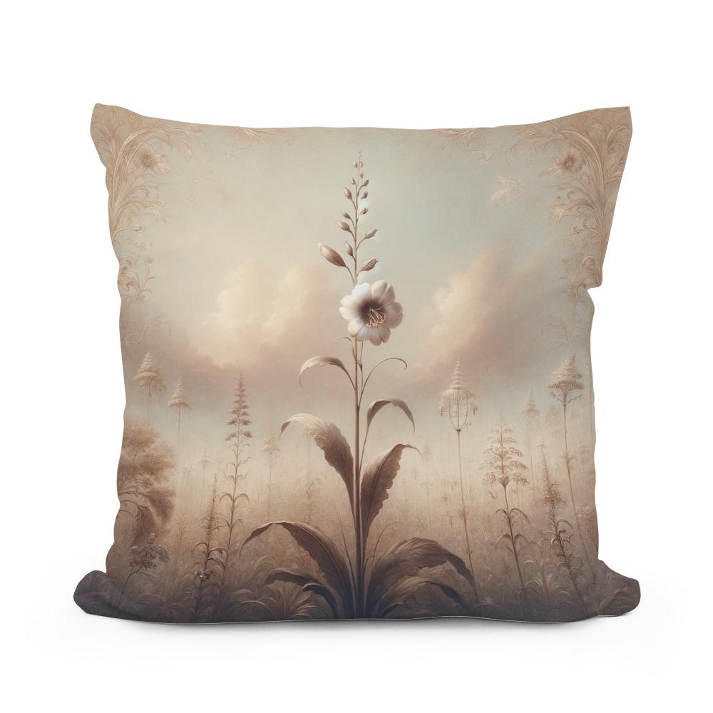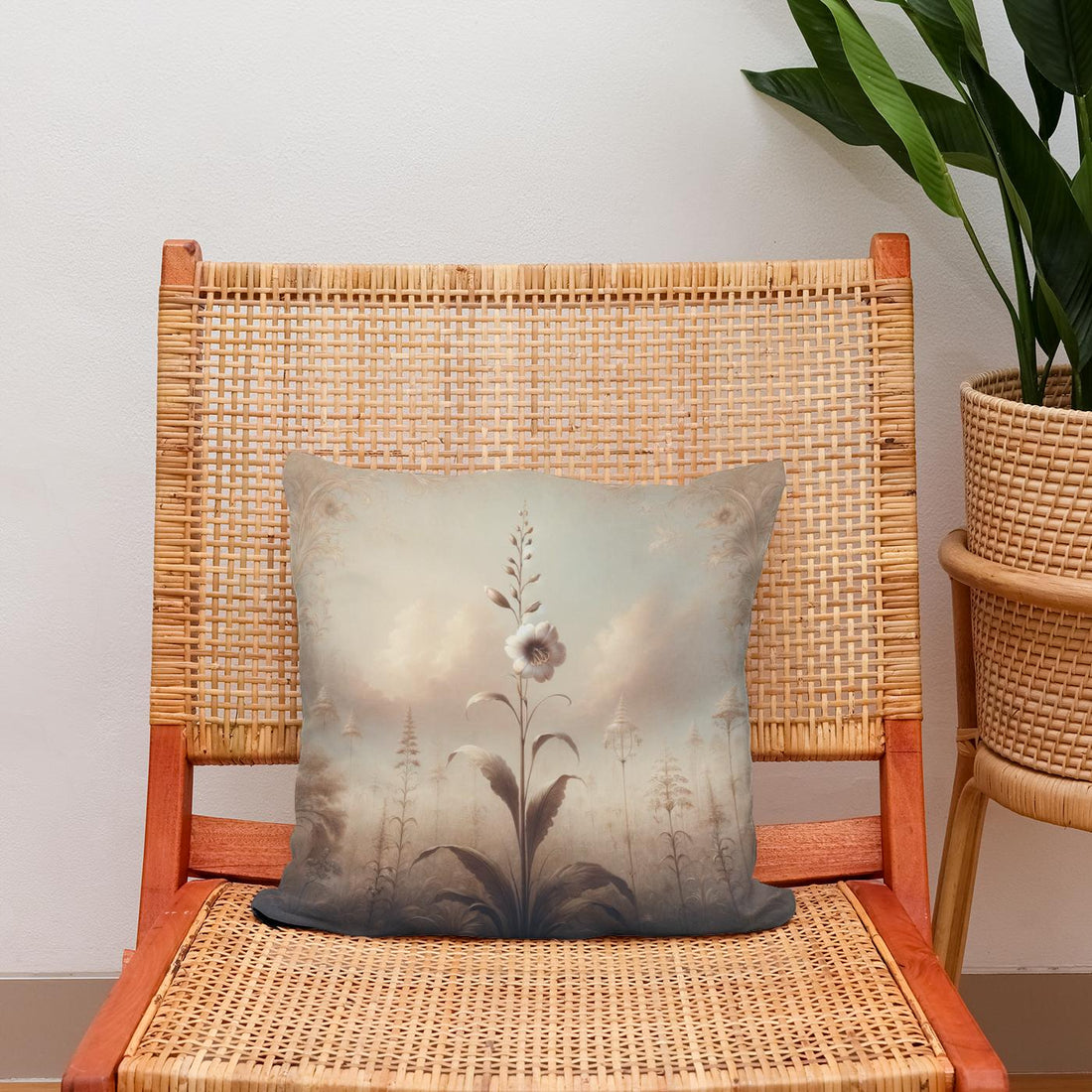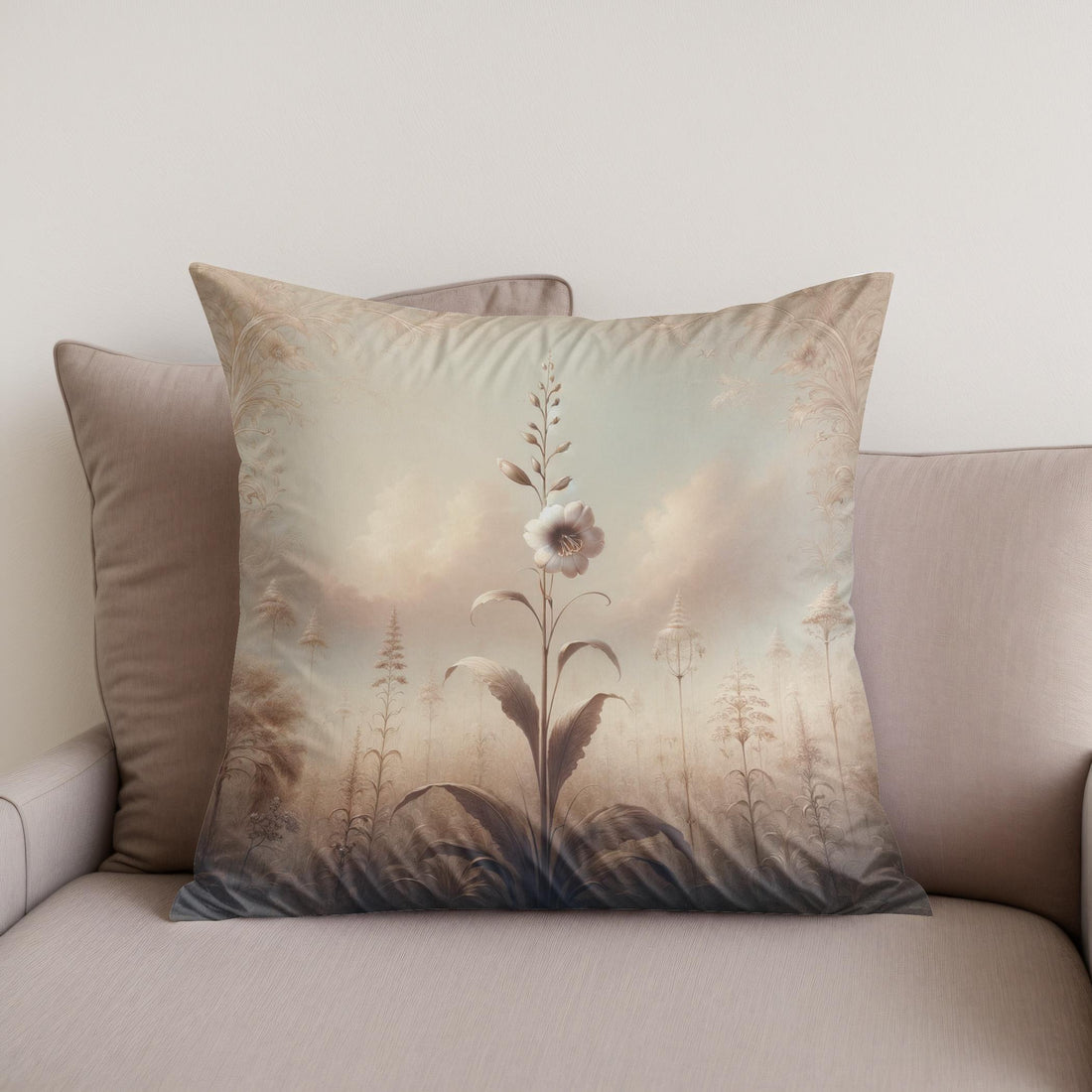 Introduce a touch of ethereal beauty to your space with this elegant cotton cushion, featuring a serene botanical scene. Set against a muted backdrop of dreamy clouds, a stately flower rises majestically at the forefront, flanked by delicately detailed filigree and whispers of mystic foliage. The soft pastel palette invokes a sense of calm and sophistication, ideal for enhancing any room with a serene and stylish flourish.
