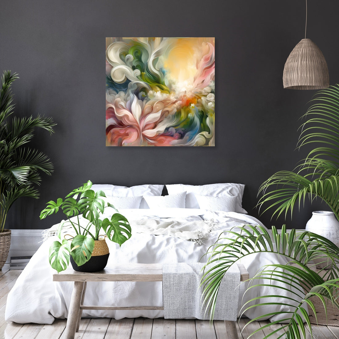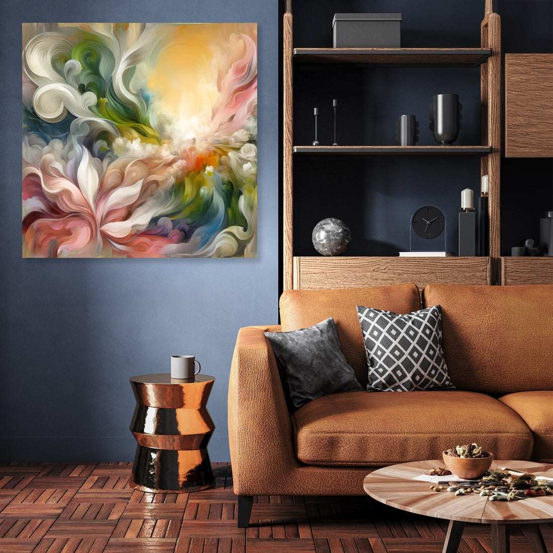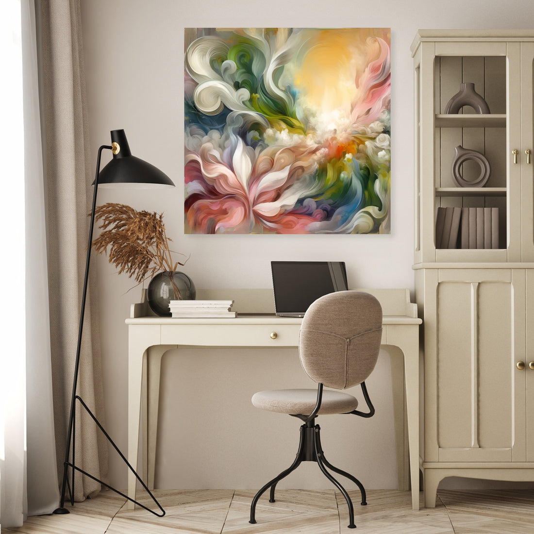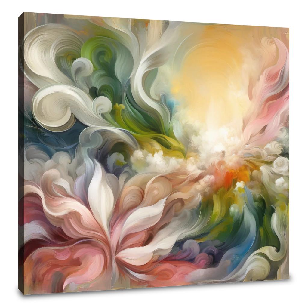 "Spring Renewal Abstract Canvas" is an exquisite piece of wall art that captures the abstract essence of spring's renewal. Using oil on canvas, this artwork weaves together soft pastels of pink, green, and yellow in swirling, organic shapes, accented with bursts of vibrant color. It evokes a sense of growth and the awakening of nature, inviting viewers to feel the energy and warmth of the spring season. Ideal for anyone looking to bring a touch of abstract beauty and the vitality of spring into their living space.