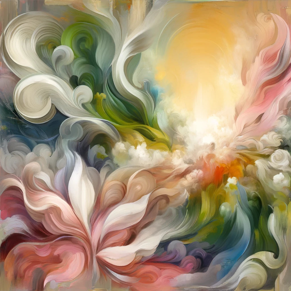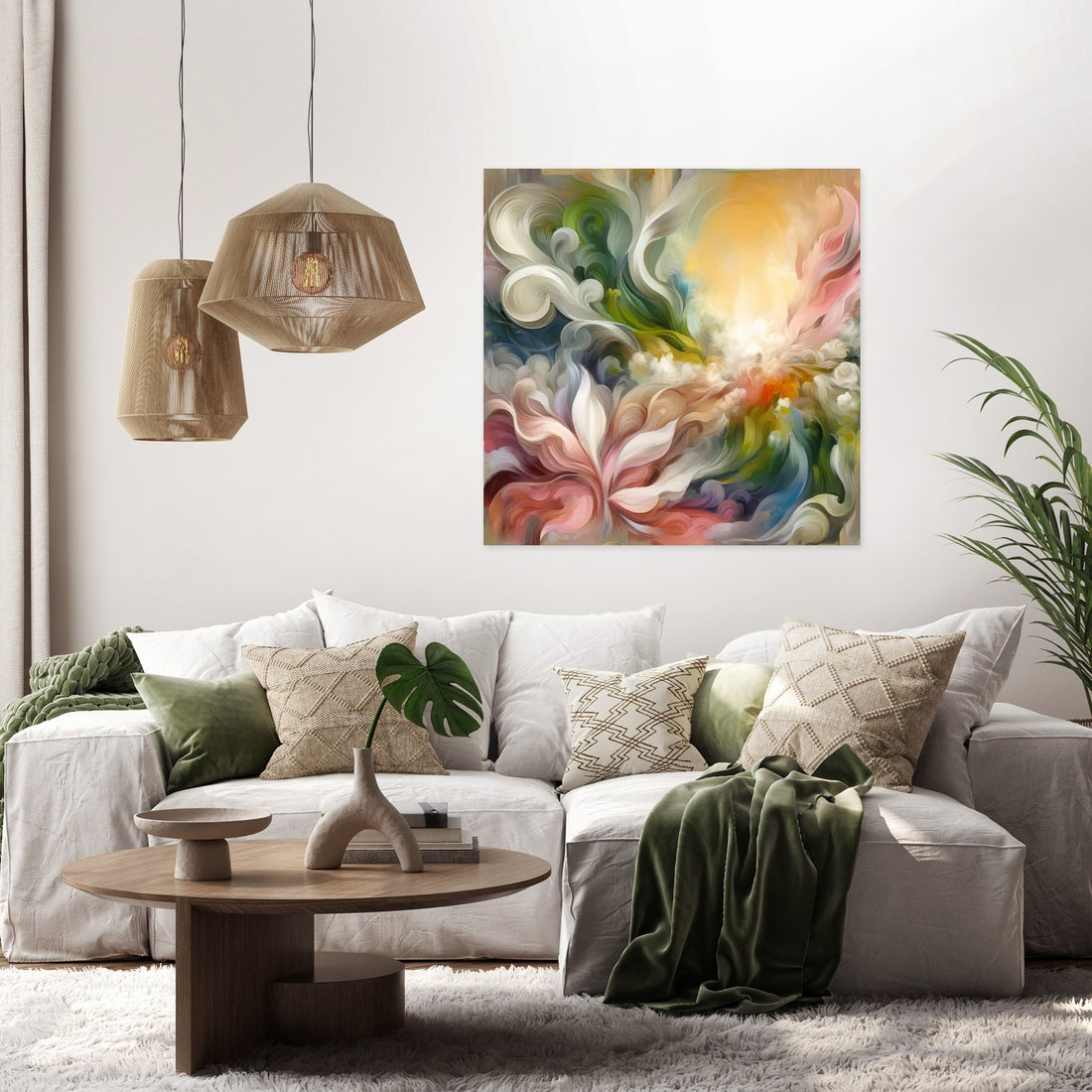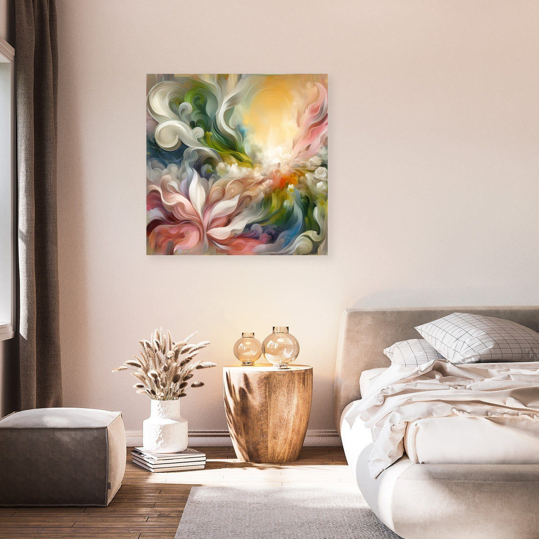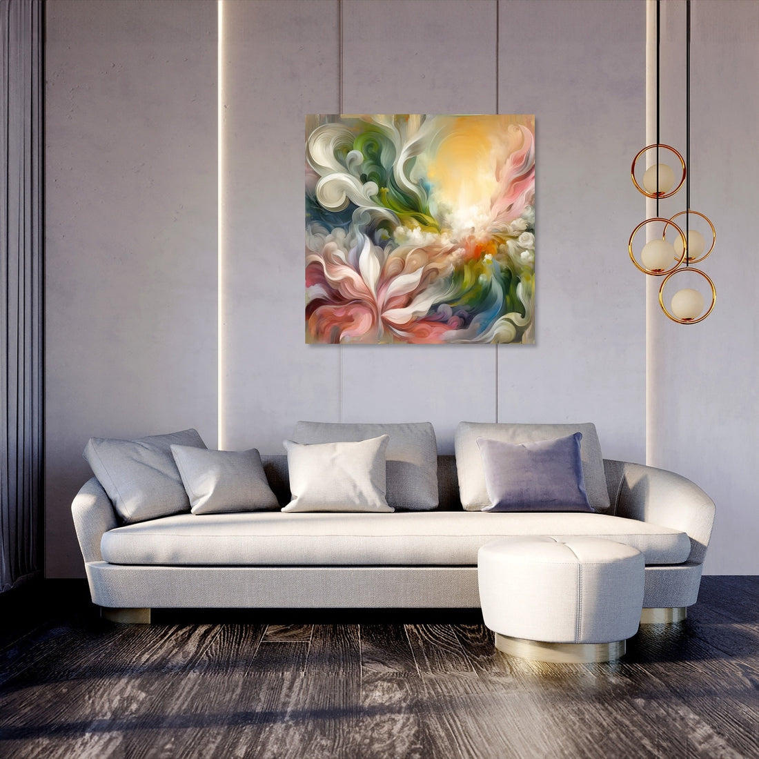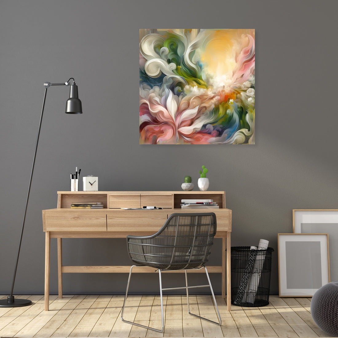 "Spring Renewal Abstract Canvas" is an exquisite piece of wall art that captures the abstract essence of spring's renewal. Using oil on canvas, this artwork weaves together soft pastels of pink, green, and yellow in swirling, organic shapes, accented with bursts of vibrant color. It evokes a sense of growth and the awakening of nature, inviting viewers to feel the energy and warmth of the spring season. Ideal for anyone looking to bring a touch of abstract beauty and the vitality of spring into their living space.