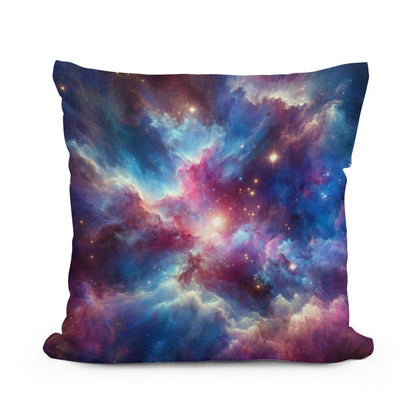Adorn your living space with this enchanting cotton pillow, featuring a mesmerizing print of a cosmic nebula. A vivid blend of cerulean blue, deep magenta, and fiery crimson swirls across the fabric, speckled with distant stars, transporting your décor into a celestial realm. Perfect for adding a touch of the infinite universe to any room.