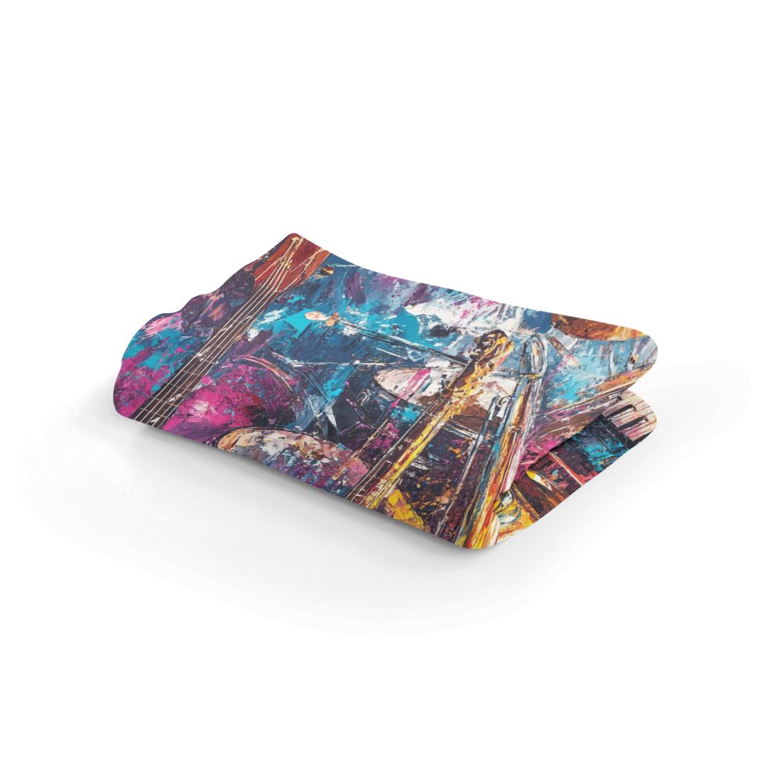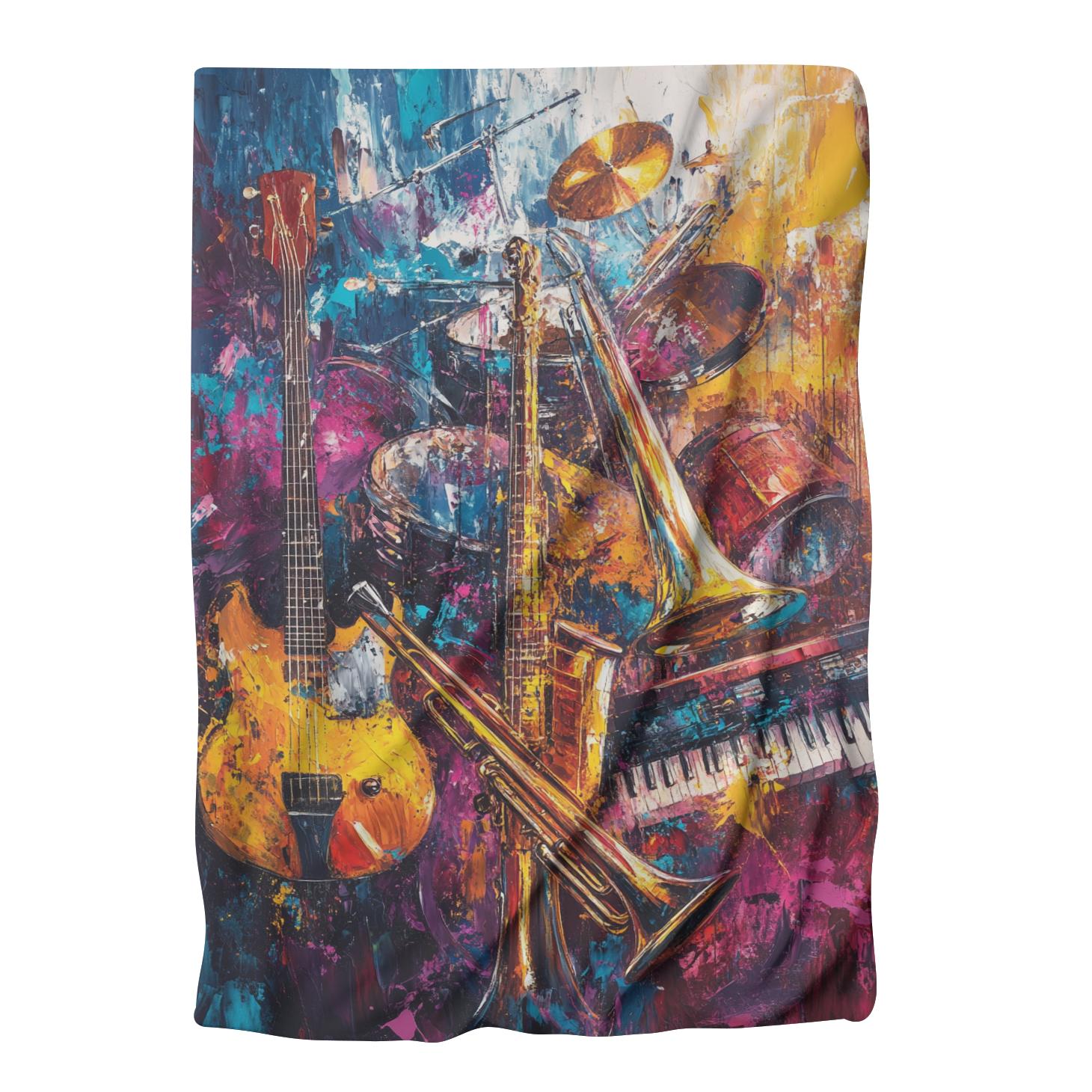 Wrap up in a symphony of colour and creativity with this vibrant blanket, featuring an expressive, abstract art print of musical instruments. The dynamic composition includes a guitar, saxophone, trumpet, and drums, set against a vivid backdrop of blues, pinks, and yellows. Perfect for music lovers, this blanket adds an artistic touch and radiant warmth to any room.