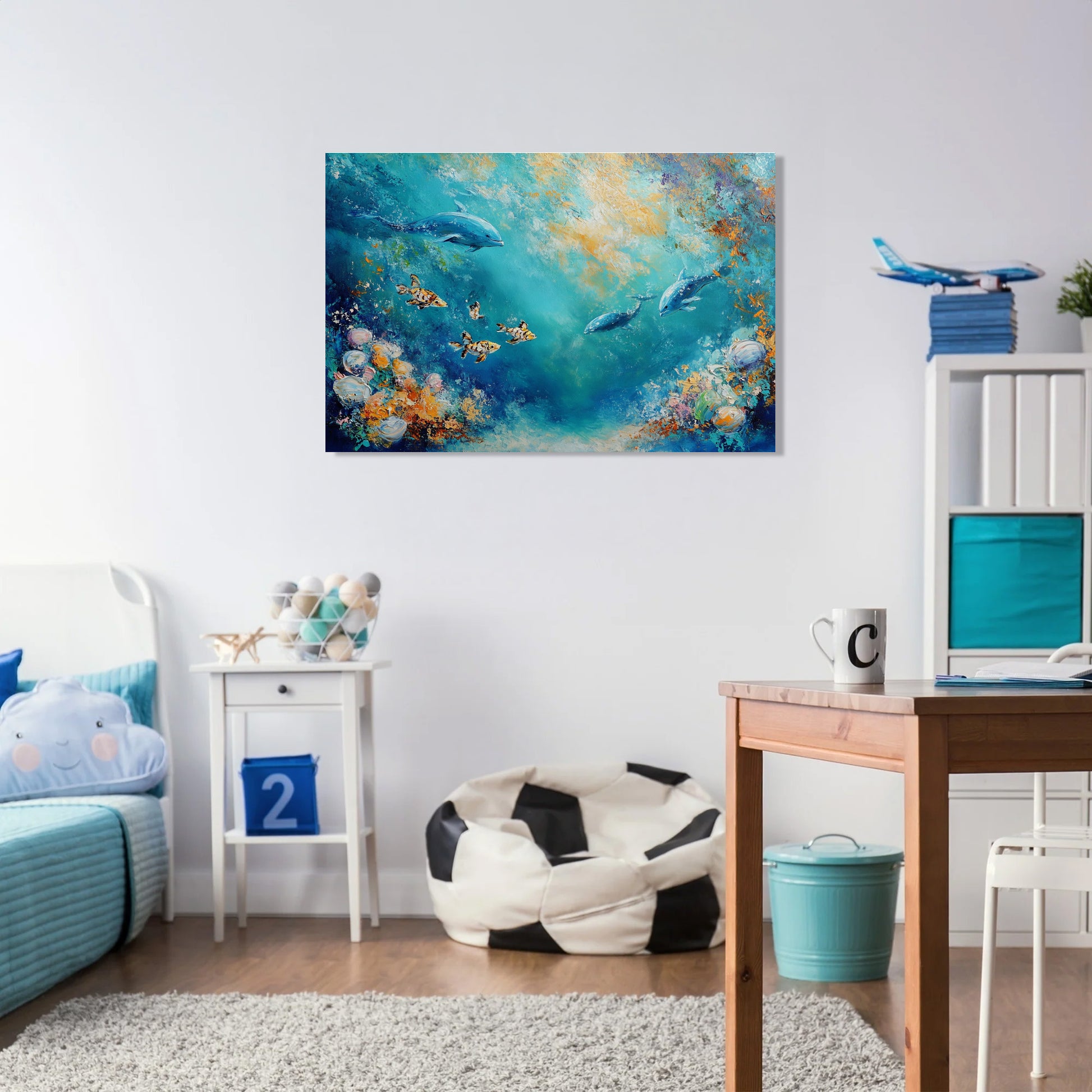 This enchanting Underwater World Canvas transforms a child's room into a vivid marine paradise. Swirling brush strokes capture the whimsical dance of little fish, turtles, and graceful dolphins amidst a landscape of coral reefs and vibrant seashells. The play of light and shadow creates an ever-changing seascape, sparking imagination and adventure. With its soothing blues and pops of coral hues, this painting adds a playful yet tranquil atmosphere, perfect for inspiring young minds and complementing any decor.