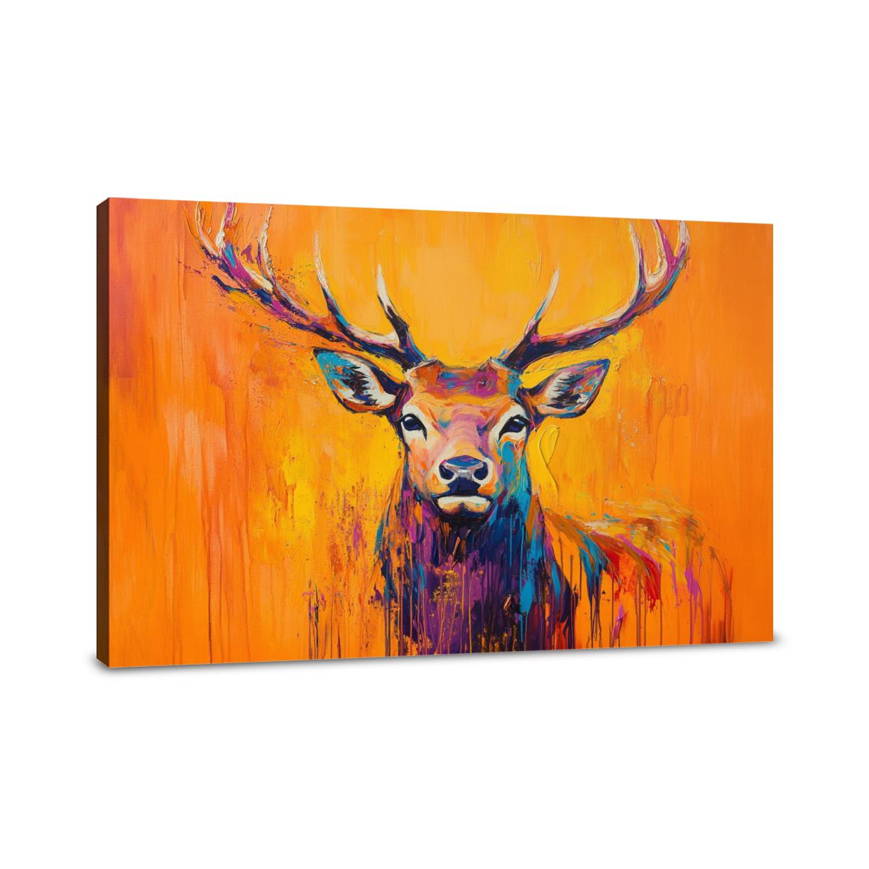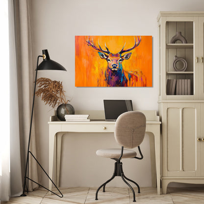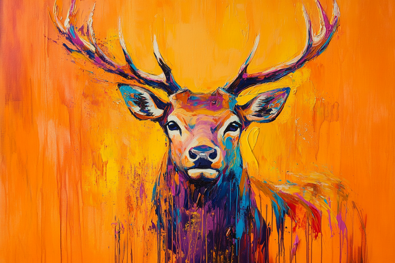 This expressive pop-art piece captures the majestic presence of a deer, set against a muted orange backdrop. The dynamic interplay of electric blue, fiery red, and vibrant yellow in impasto textures creates a captivating visual dance. Thick, sculptural brushstrokes lend a tactile quality, making the deer appear almost alive. Ideal for adding an energising touch to any room, this artwork’s lively colours and vivid movement infuse spaces with a sense of vitality and artistic flair.