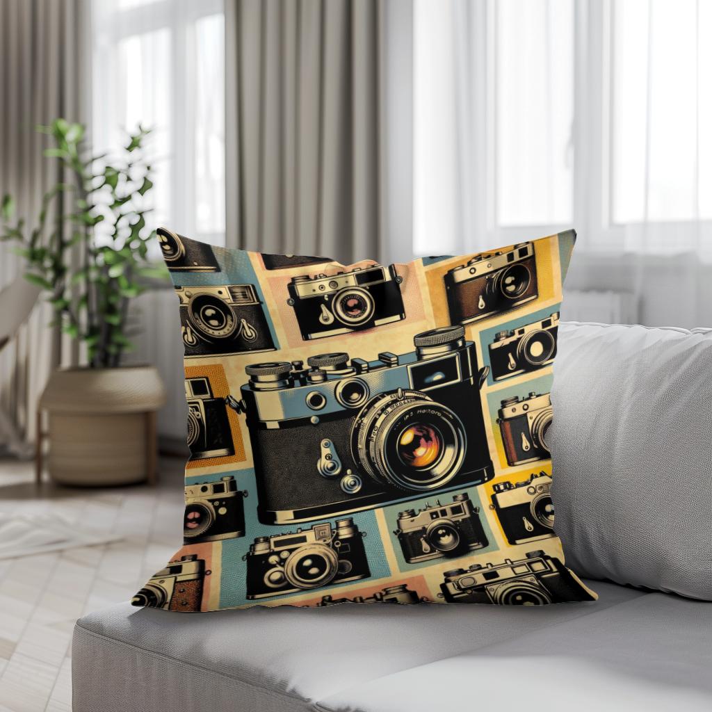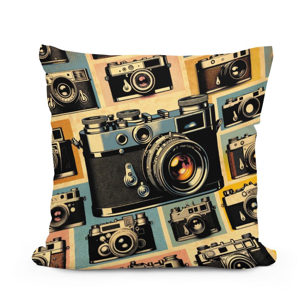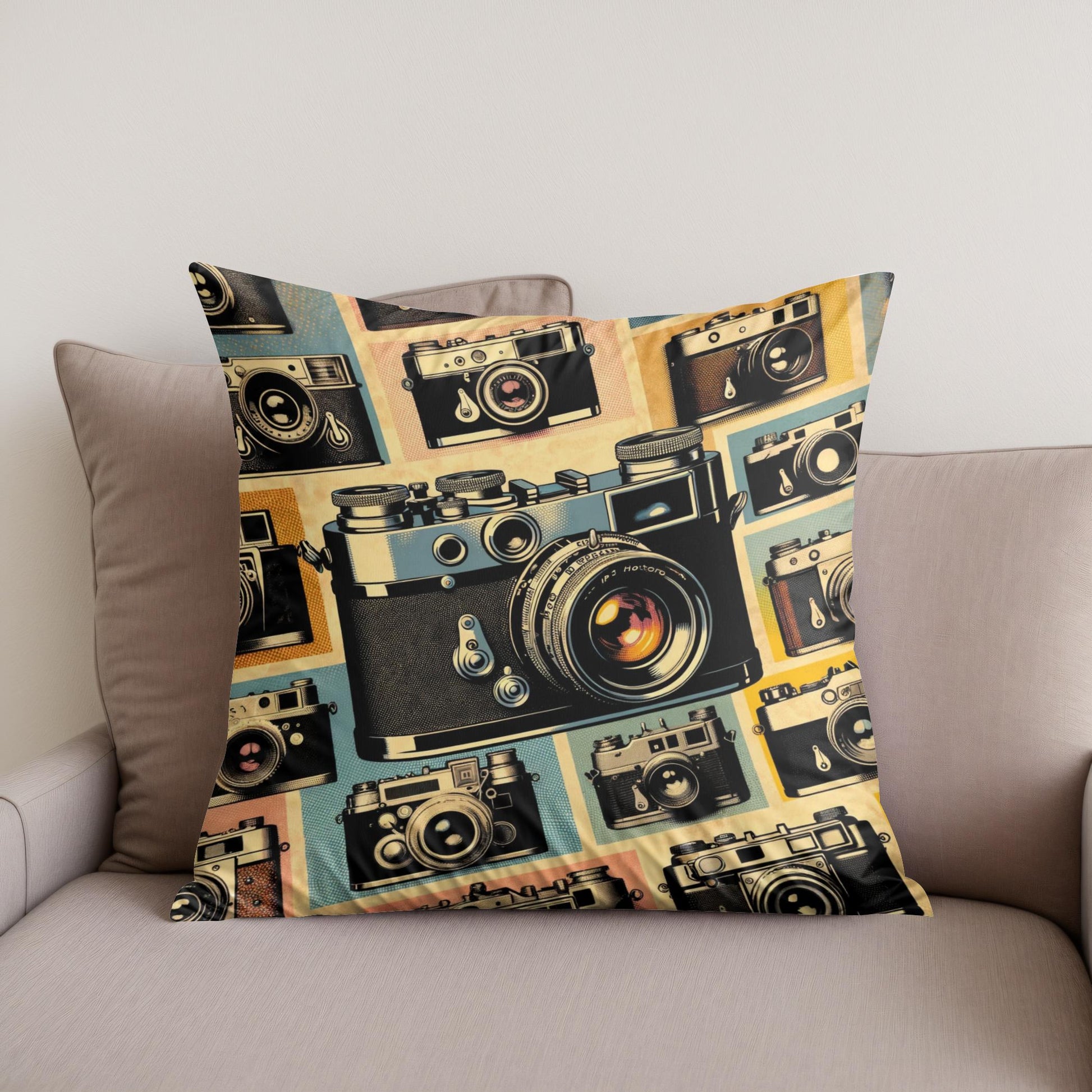 Add a touch of vintage flair to your living space with this charming cotton cushion, featuring an eclectic array of classic cameras in a collage style. Each camera is beautifully illustrated in rich detail, exuding a nostalgic vibe that is perfect for photography enthusiasts or anyone who appreciates retro aesthetics. The design, set against a soft, pastel background, combines both style and comfort, making it an ideal accessory for adding character to any room.