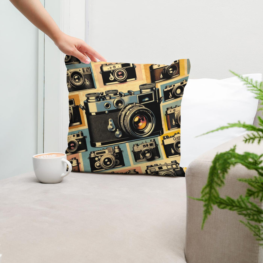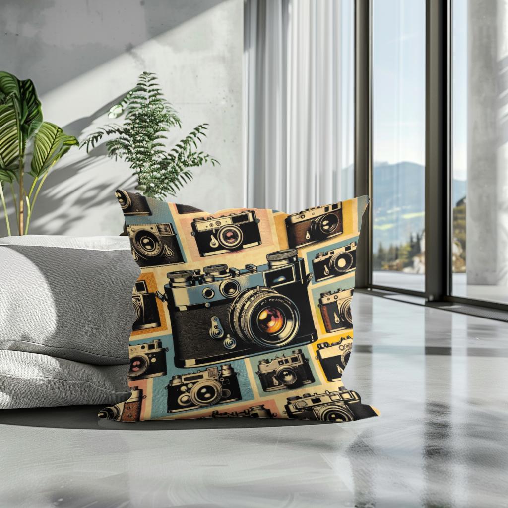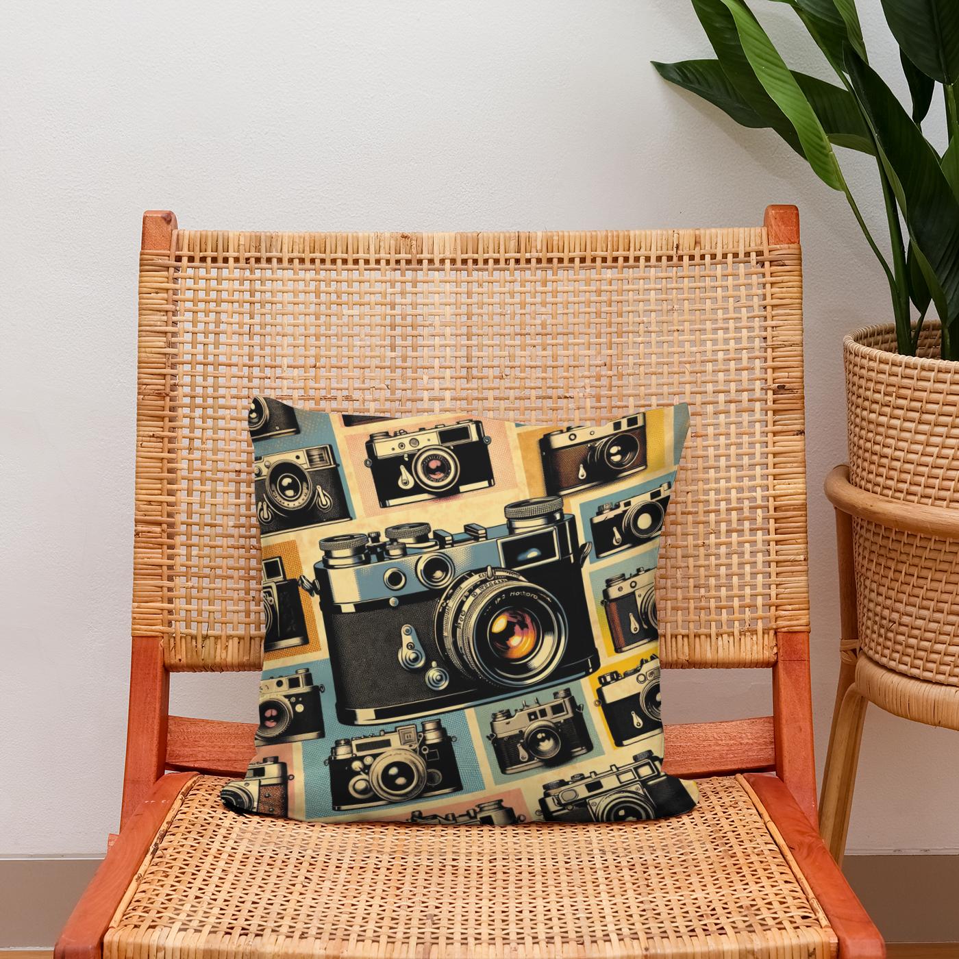 Add a touch of vintage flair to your living space with this charming cotton cushion, featuring an eclectic array of classic cameras in a collage style. Each camera is beautifully illustrated in rich detail, exuding a nostalgic vibe that is perfect for photography enthusiasts or anyone who appreciates retro aesthetics. The design, set against a soft, pastel background, combines both style and comfort, making it an ideal accessory for adding character to any room.