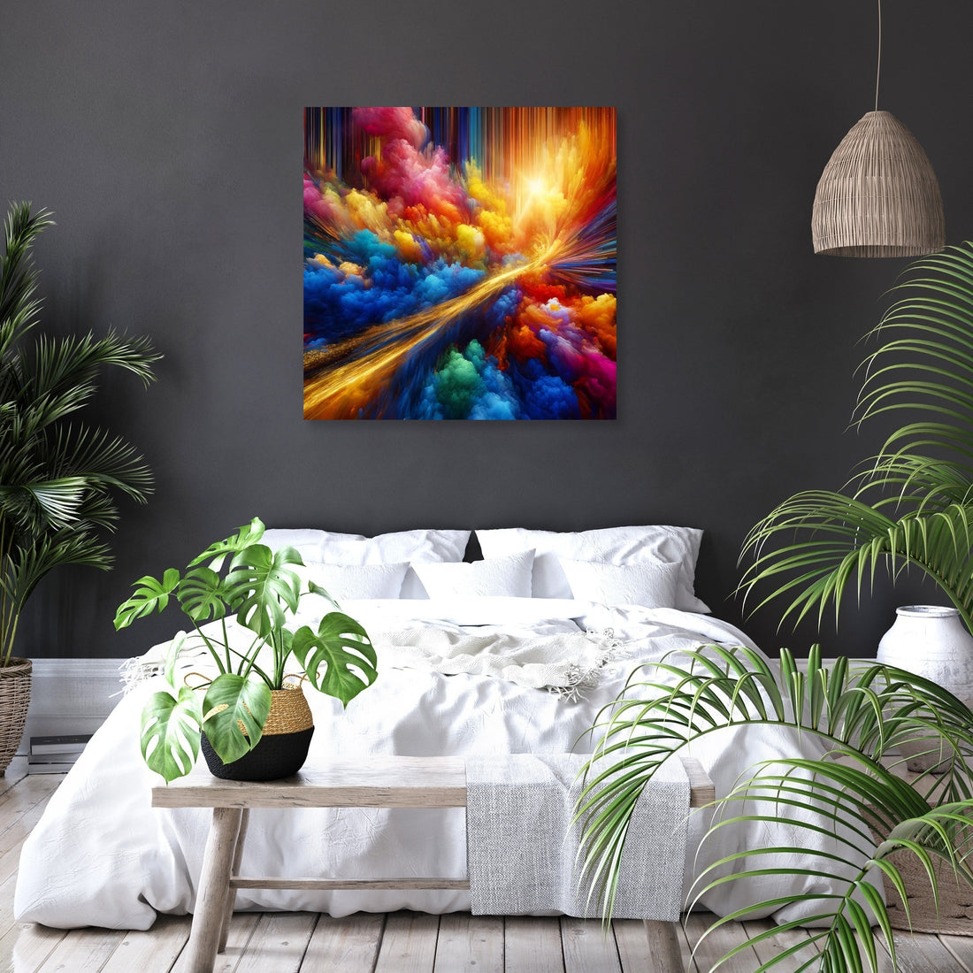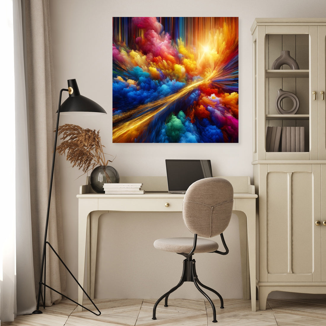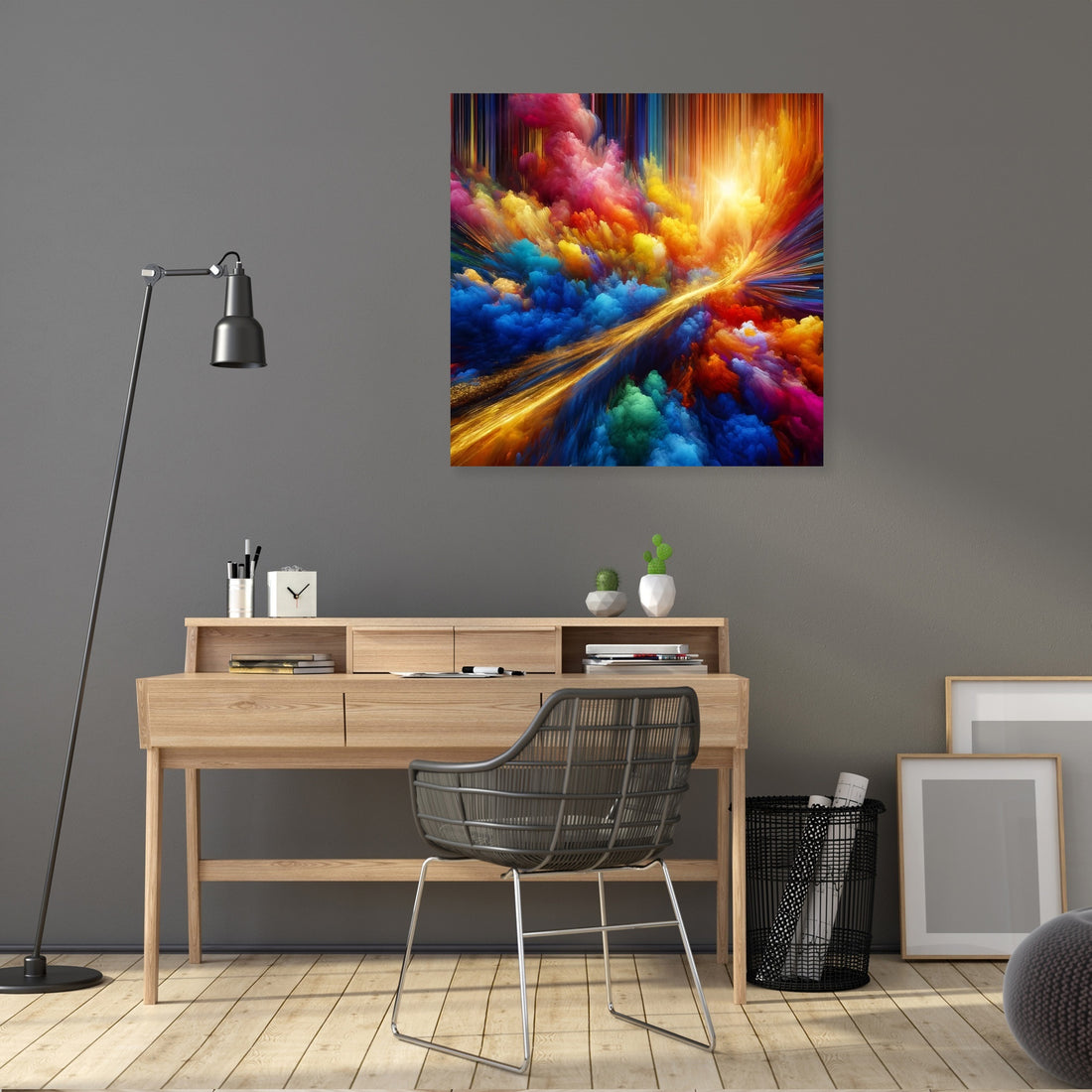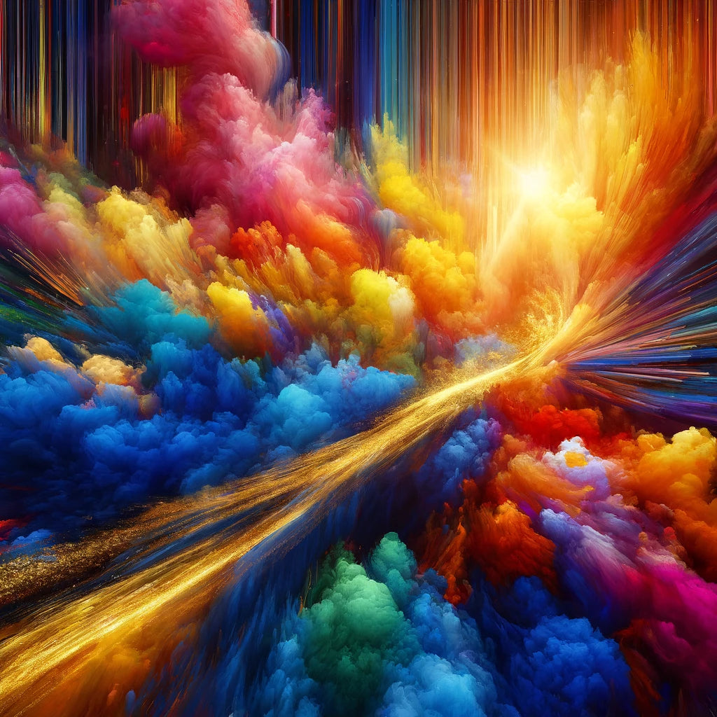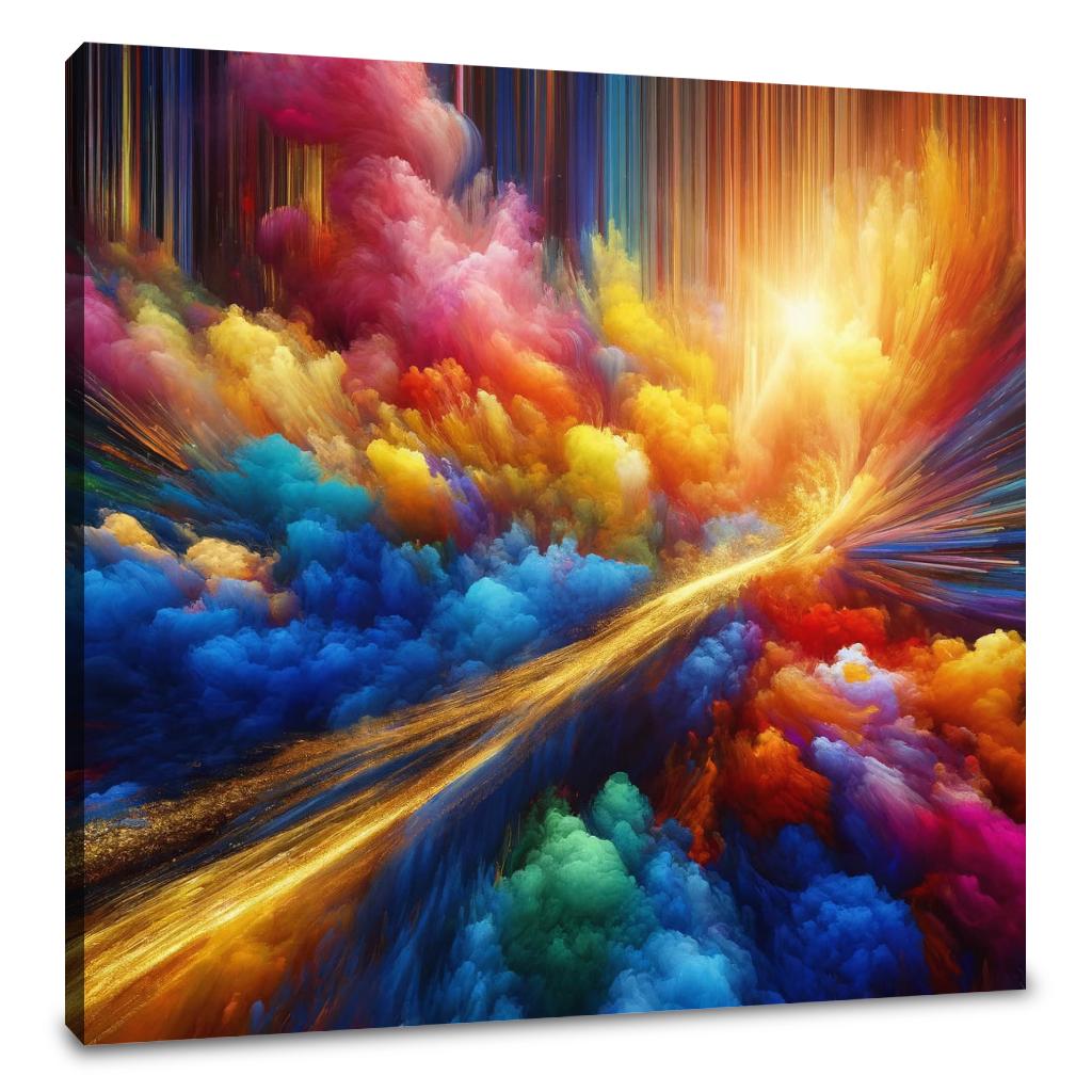 "Vivid Essence Canvas" is a captivating abstract creation that vibrates with the raw energy of nature's most vivid colors. Electric blues, radiant yellows, and hot pinks engage in a dynamic abstract dance, capturing the essence of life's vibrancy and the spontaneous beauty of the natural world. Cutting through this riot of color is a singular streak of gold, reminiscent of a fleeting sunbeam filtering through dense foliage, adding an element of depth and mystery. This artwork is an invitation to immerse oneself in a world where color is not just seen but felt, echoing the perpetual motion and interplay of light and shadow. A piece that not only adorns a space but also infuses it with the energetic pulse of life and the subtle luxury of gold.