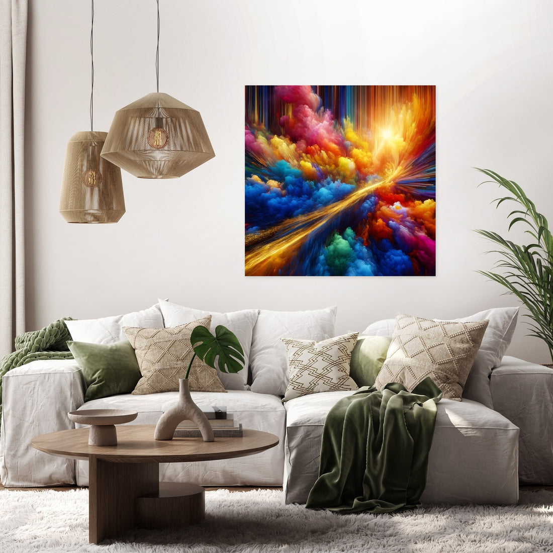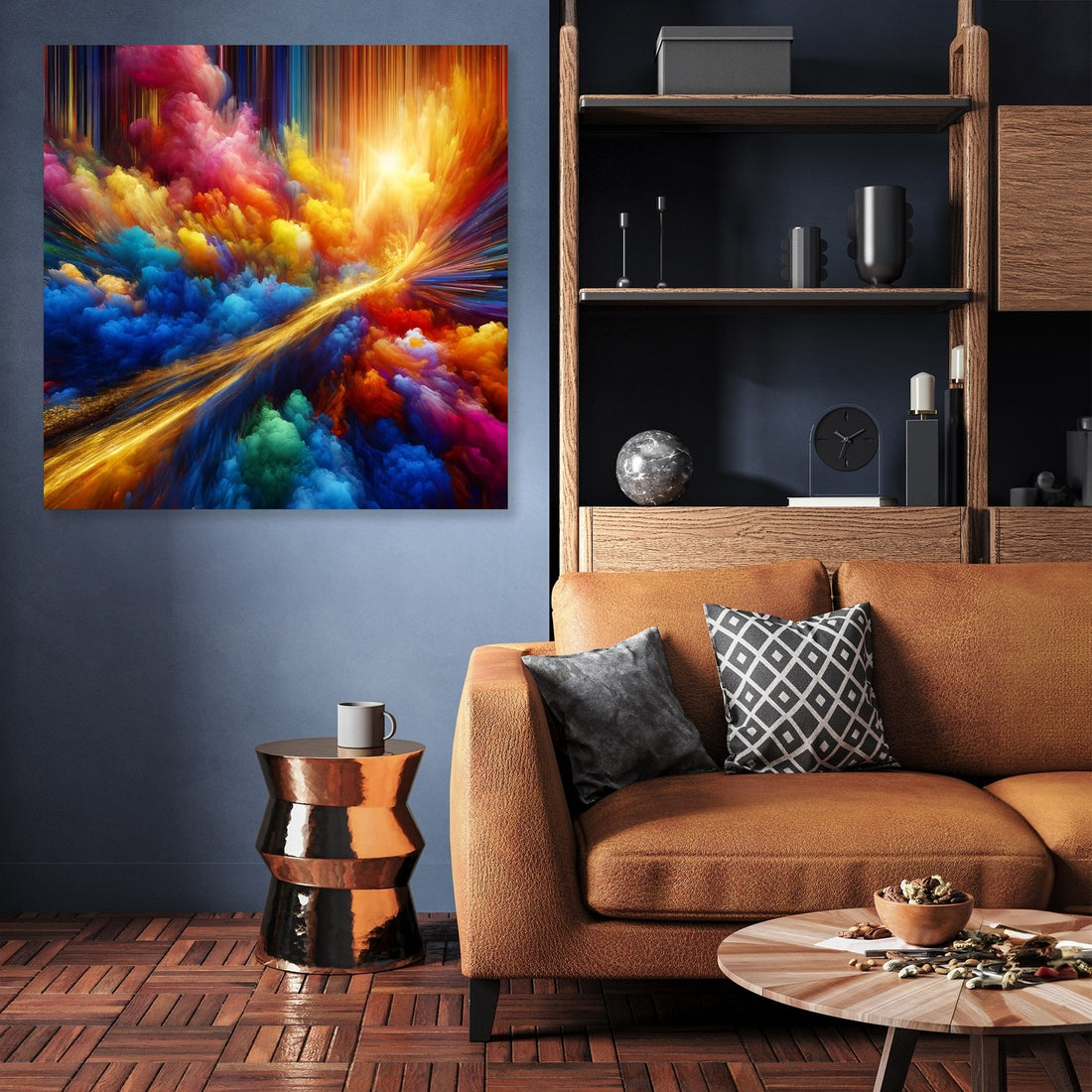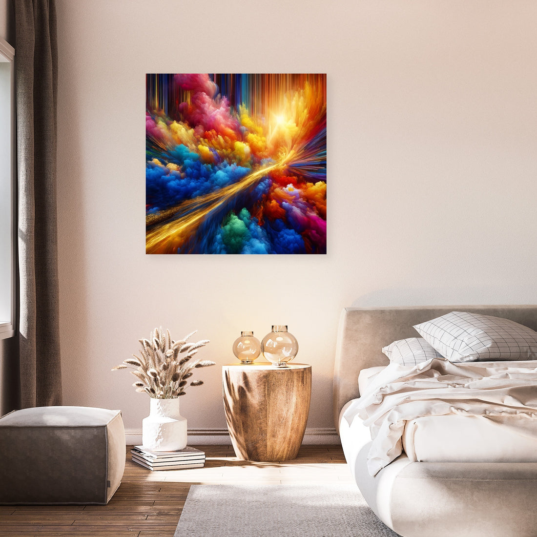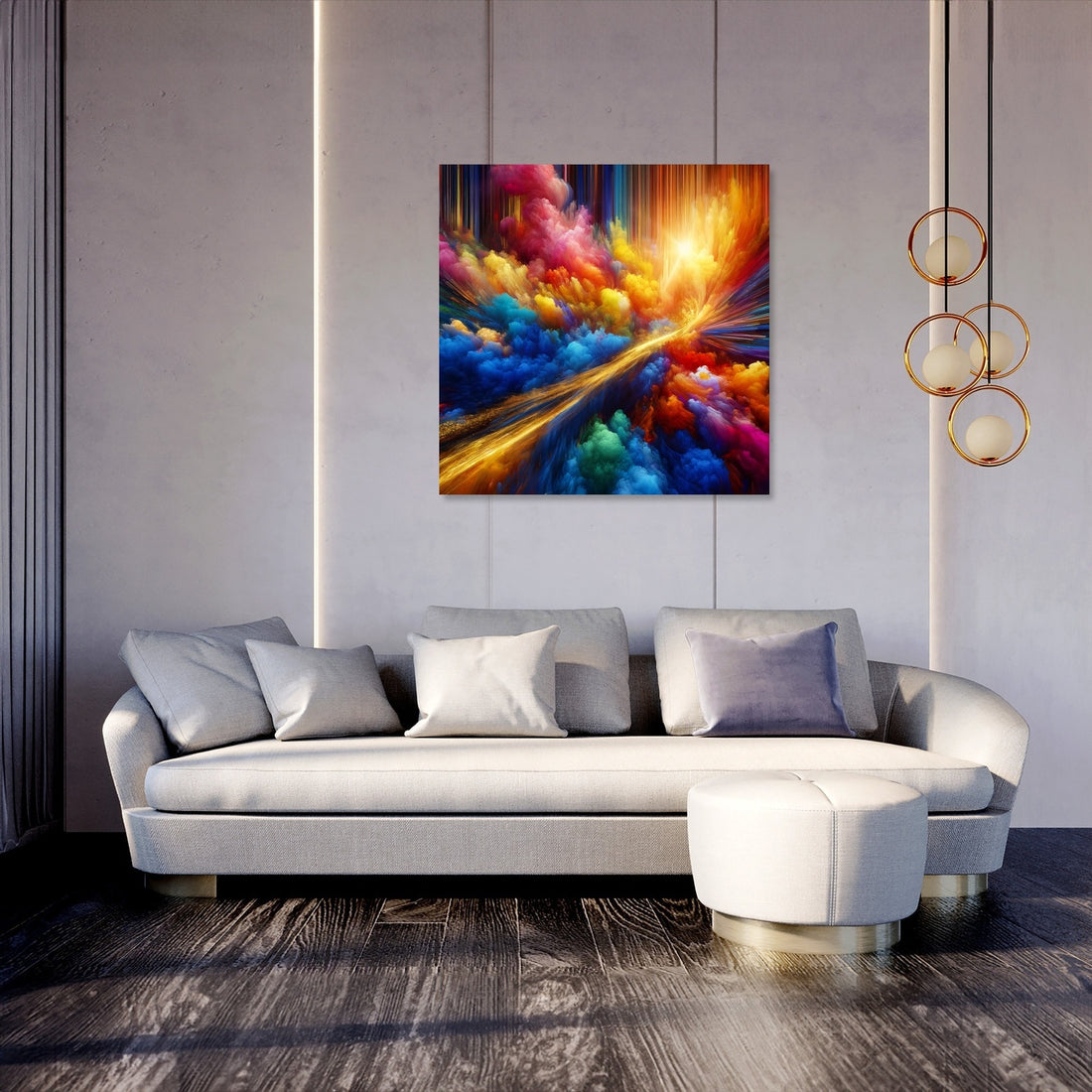 "Vivid Essence Canvas" is a captivating abstract creation that vibrates with the raw energy of nature's most vivid colors. Electric blues, radiant yellows, and hot pinks engage in a dynamic abstract dance, capturing the essence of life's vibrancy and the spontaneous beauty of the natural world. Cutting through this riot of color is a singular streak of gold, reminiscent of a fleeting sunbeam filtering through dense foliage, adding an element of depth and mystery. This artwork is an invitation to immerse oneself in a world where color is not just seen but felt, echoing the perpetual motion and interplay of light and shadow. A piece that not only adorns a space but also infuses it with the energetic pulse of life and the subtle luxury of gold.