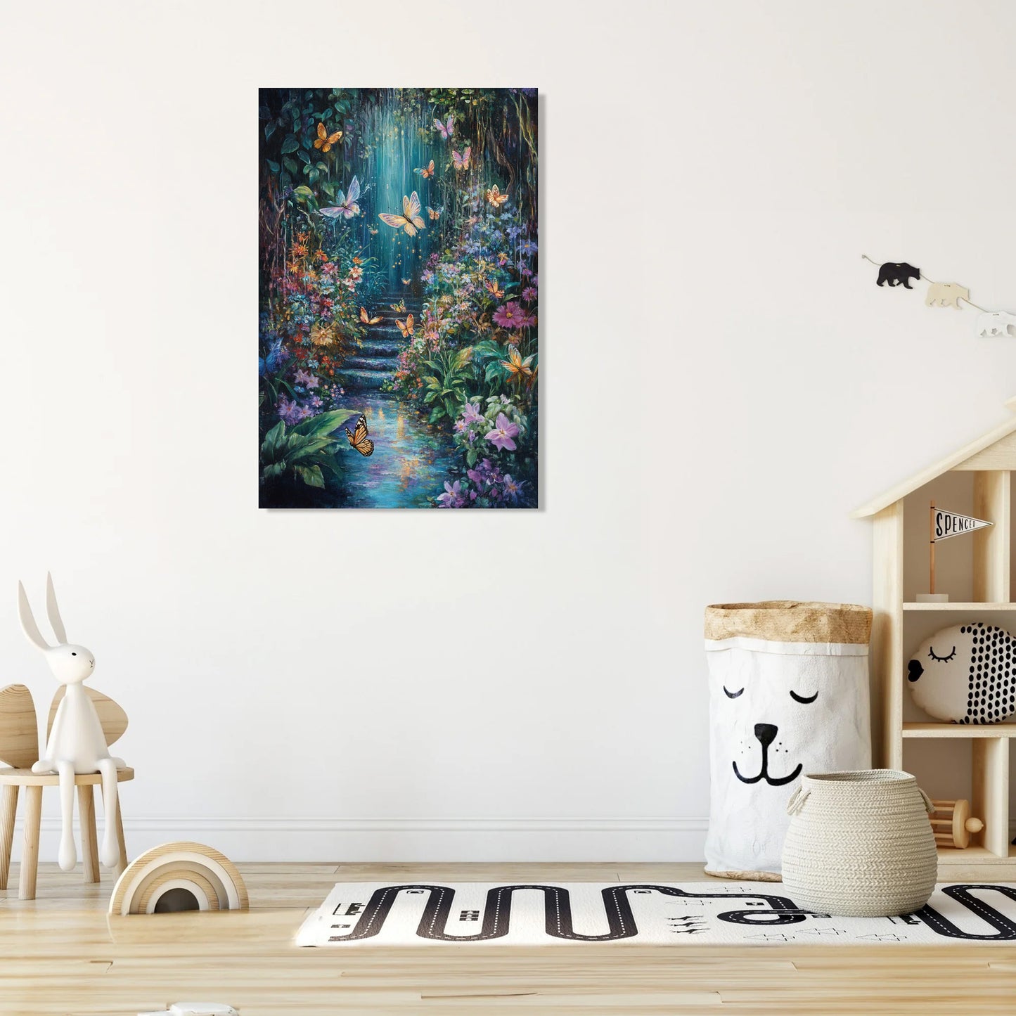 This captivating artwork, perfect for a child's room, portrays a whimsical fairy garden teeming with life and magic. Enchanting fairies and fluttering butterflies dance amidst vibrant foliage, while fireflies add a touch of sparkle to the scene. The Impressionist style, with its dynamic brush strokes and luminous play of light, creates a dreamy, imaginative atmosphere. The vivid palette of greens, purples, and golds enchants the viewer, making it an ideal addition to spark creativity and joy in any young person's space.