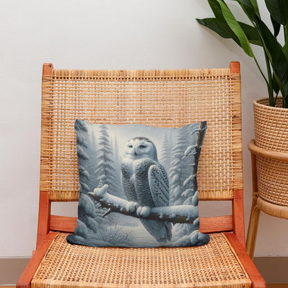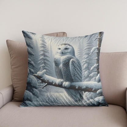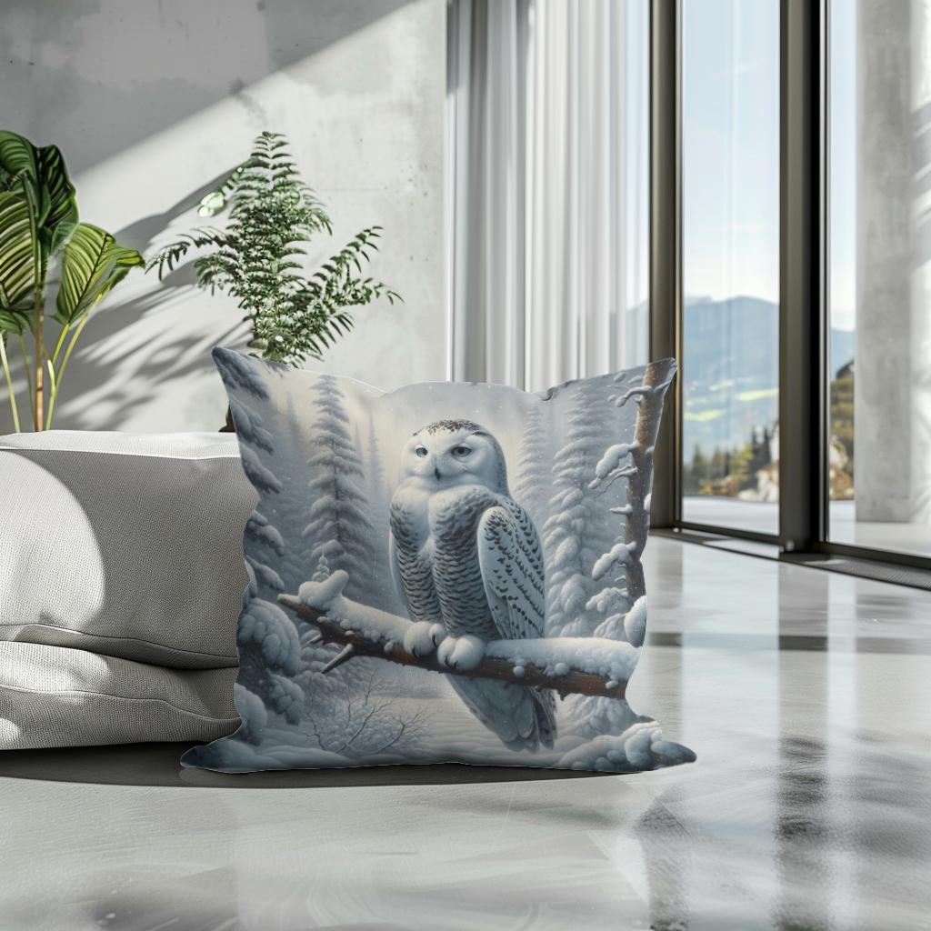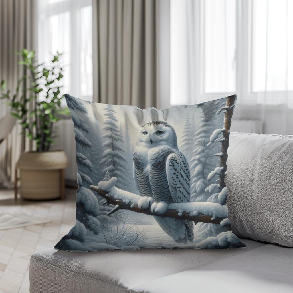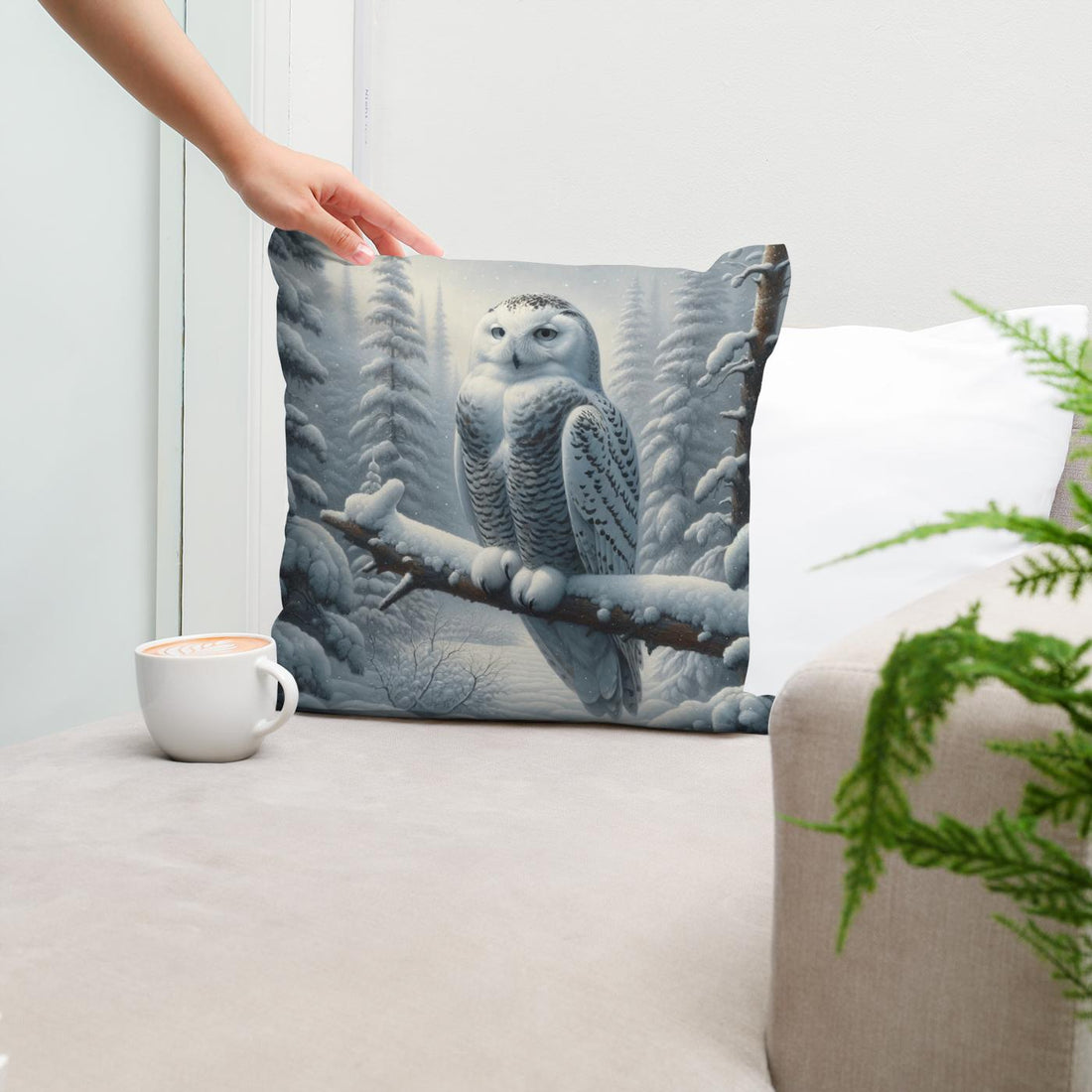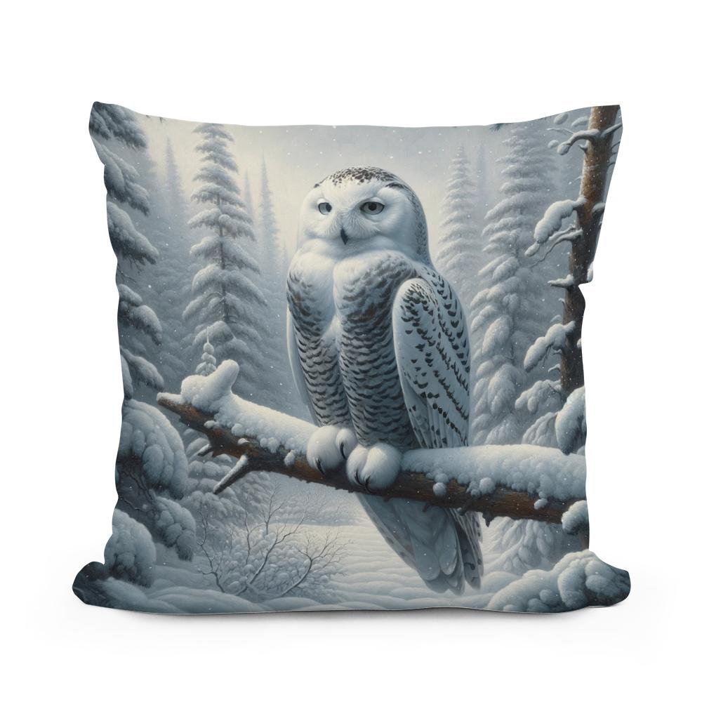 This elegantly crafted cotton cushion features a serene depiction of a majestic snowy owl perched gracefully on a frost-covered branch. Surrounded by a tranquil forest of snowy pines under a soft, wintry sky, the image exudes a peaceful and enchanting atmosphere, perfect for adding a touch of winter wonder to any room. The detailed artistry and soothing palette make this cushion a delightful accessory for those who appreciate the beauty of nature's quiet moments.