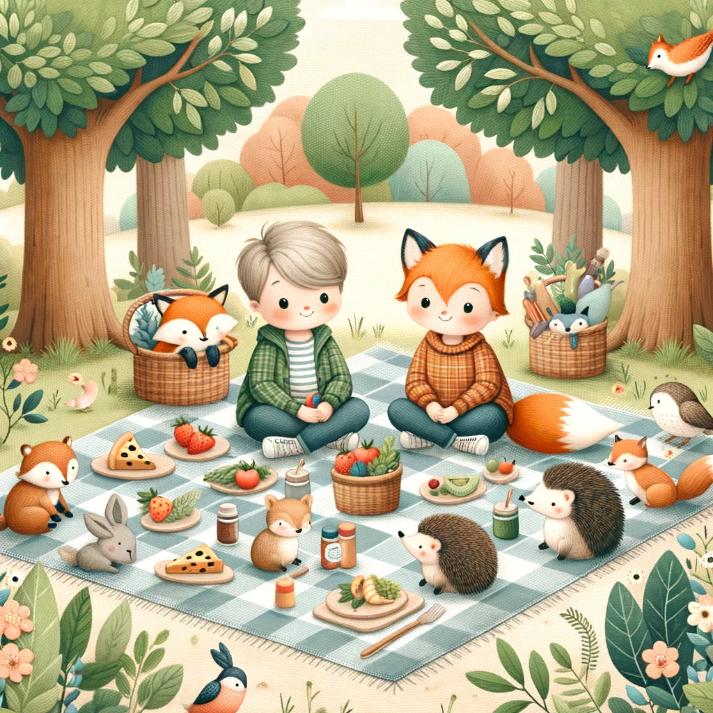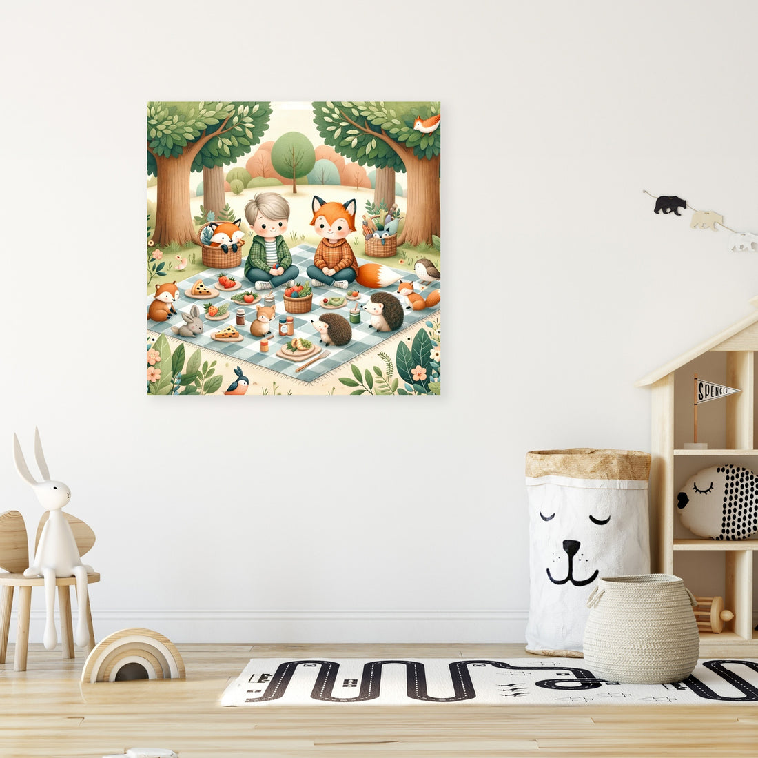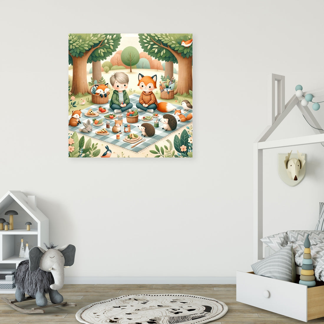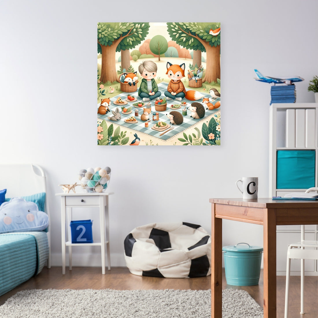 Add a touch of nature's charm to your child's room with this delightful wall art. Featuring a woodland picnic with children sitting on a checkered blanket surrounded by friendly foxes, hedgehogs, and birds, this scene is cosy and inviting. The soft green leaves of the trees and pastel-coloured picnic setup create a serene and whimsical atmosphere perfect for any nursery or playroom.