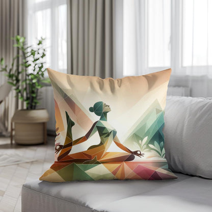 Enhance your space with this captivating cotton cushion, featuring a stylised, geometric illustration of a woman in a serene yoga pose. Set against a backdrop of abstract, angular mountains and soft foliage, the image uses a soothing palette of earth tones that evoke a sense of peace and tranquillity. Perfect for adding a touch of calm and contemporary style to any room.