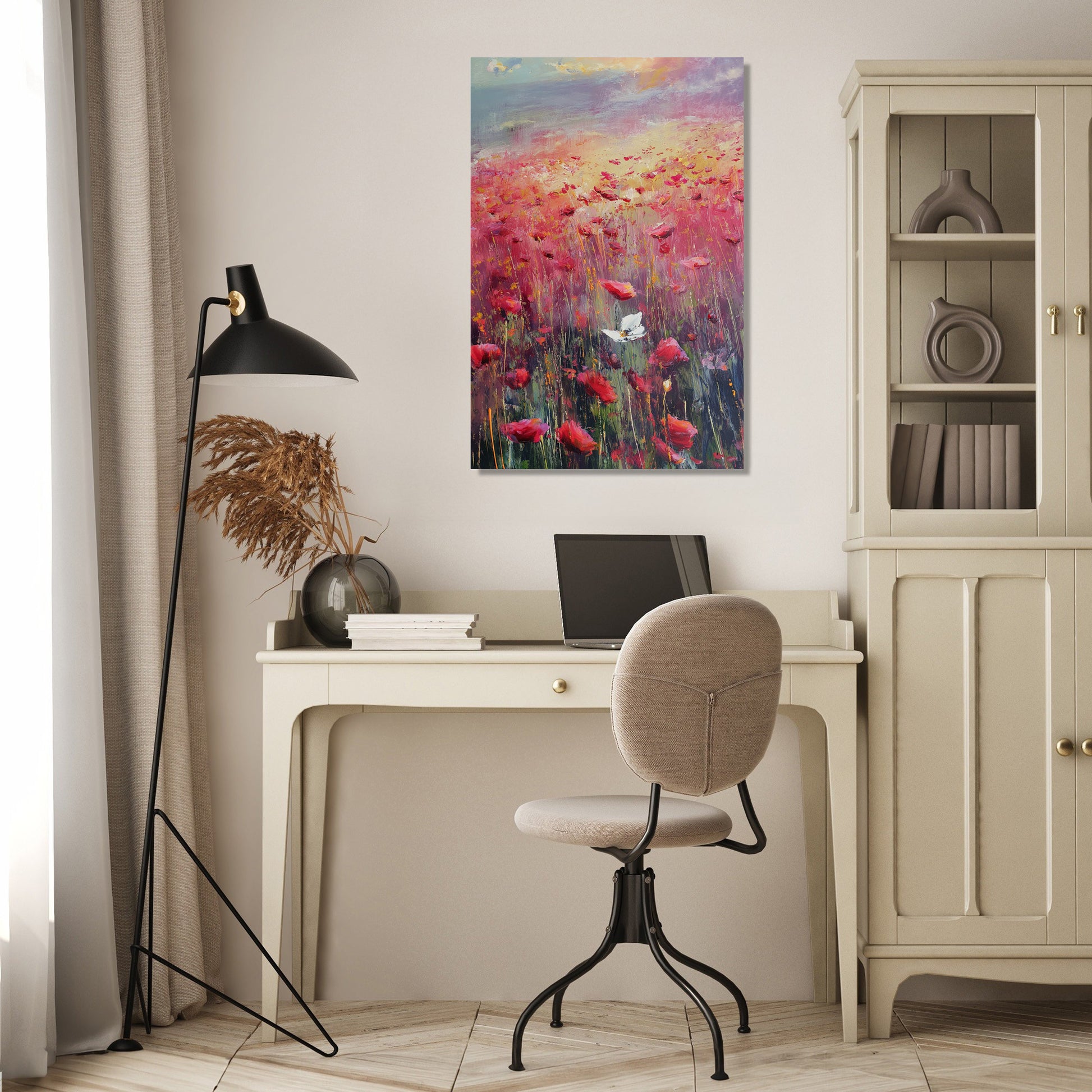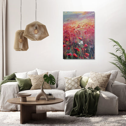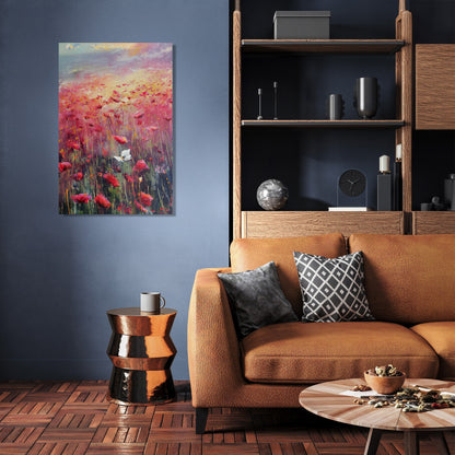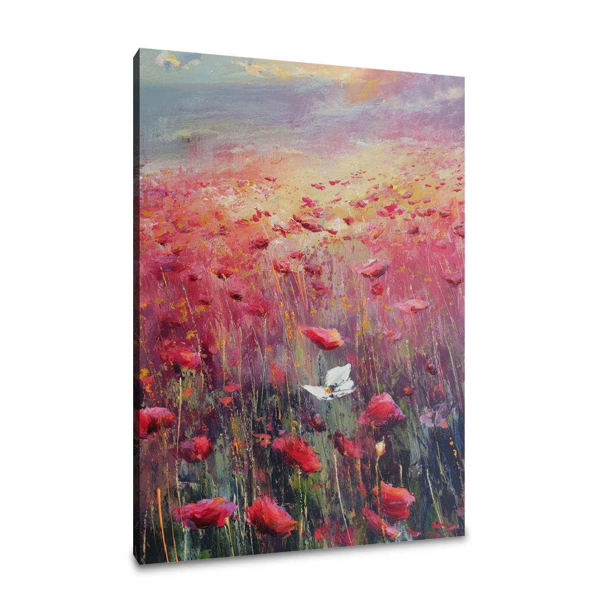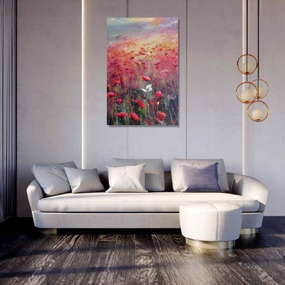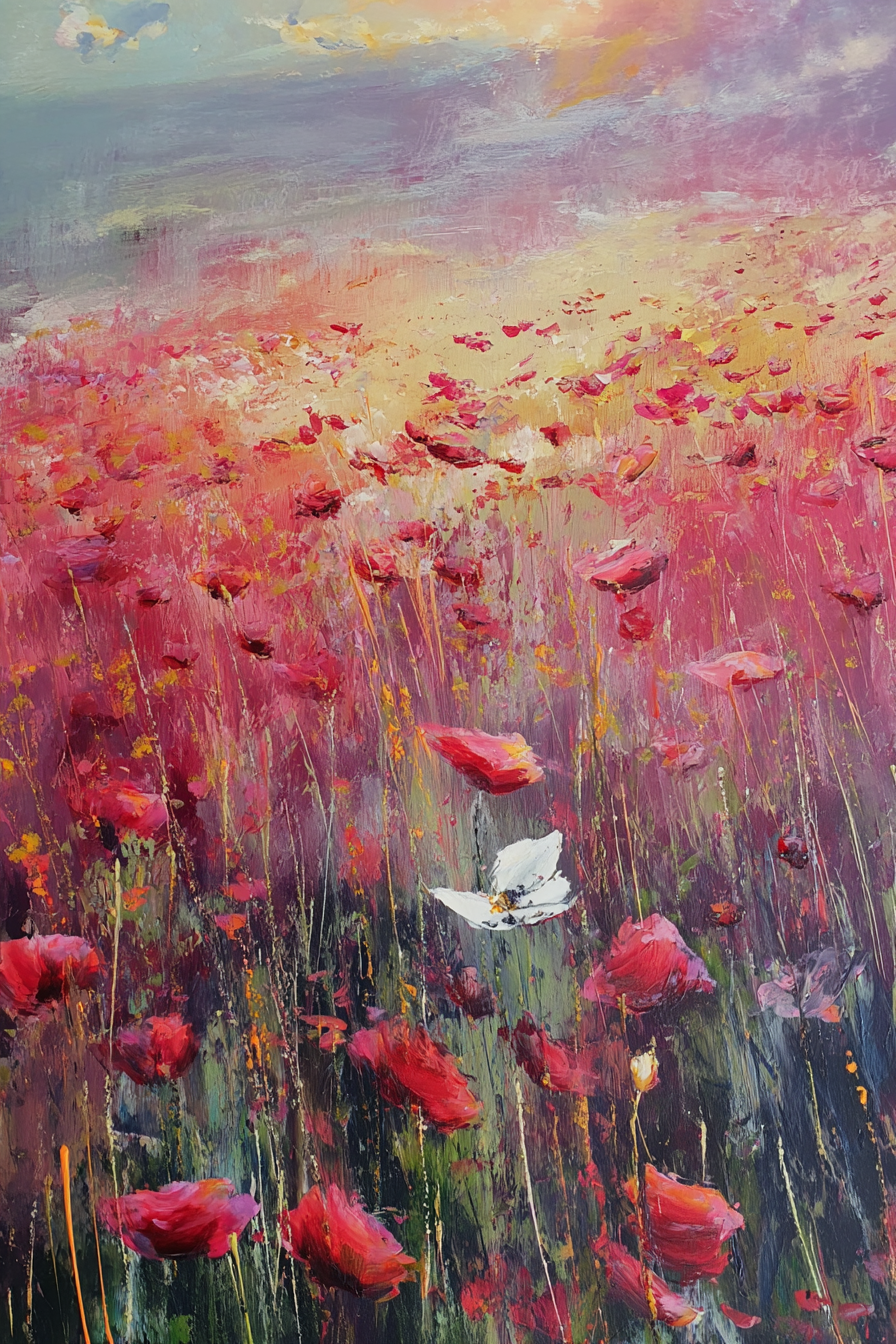This impressionistic artwork beautifully portrays a poppy field with the symbolic presence of the Yorkshire white rose, brought to life with visible brush strokes that capture a warm, melancholic light. The vivid reds of the poppies contrast gently with the serene white blooms, creating a harmonious and contemplative piece. Ideal for both home and office spaces, this painting adds a touch of elegance and depth, evoking a soothing yet emotionally rich ambience that enhances any decor.