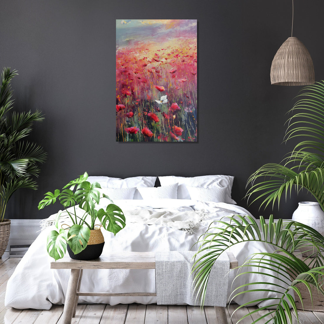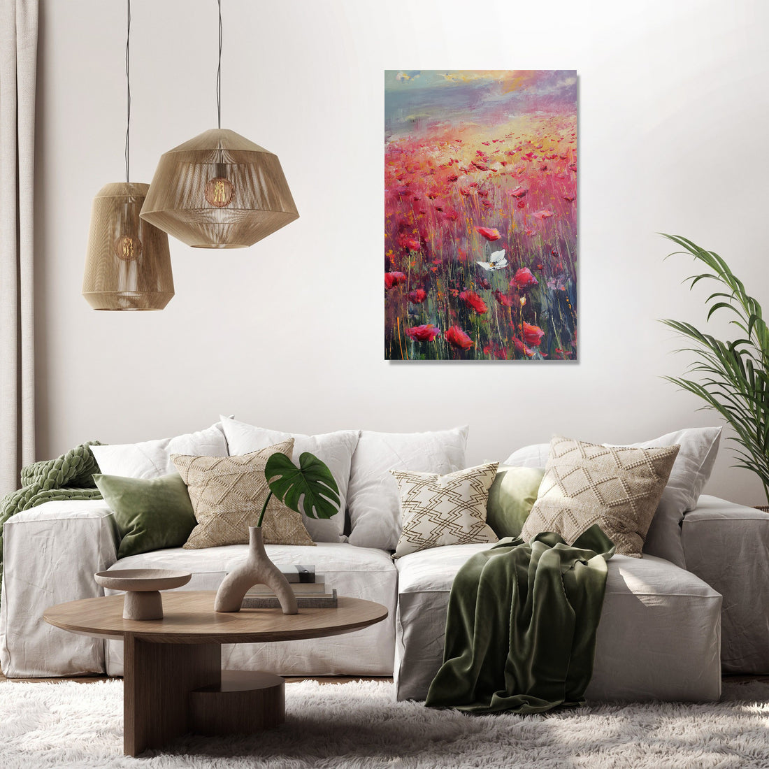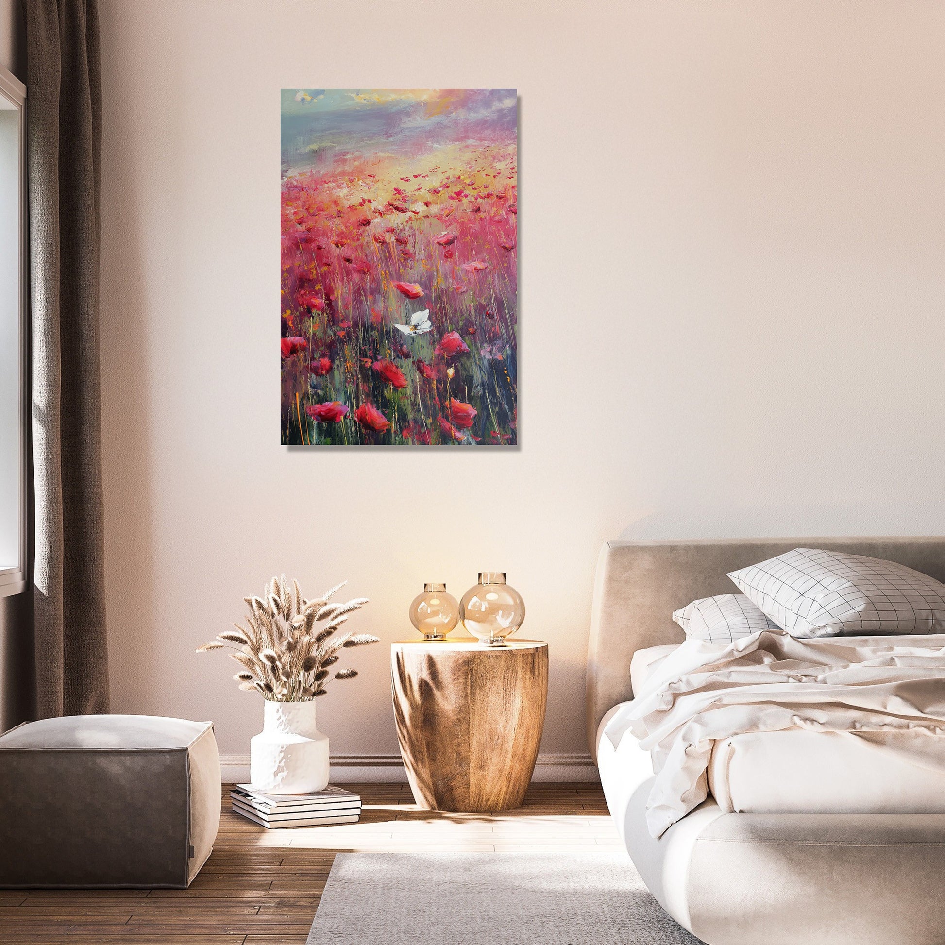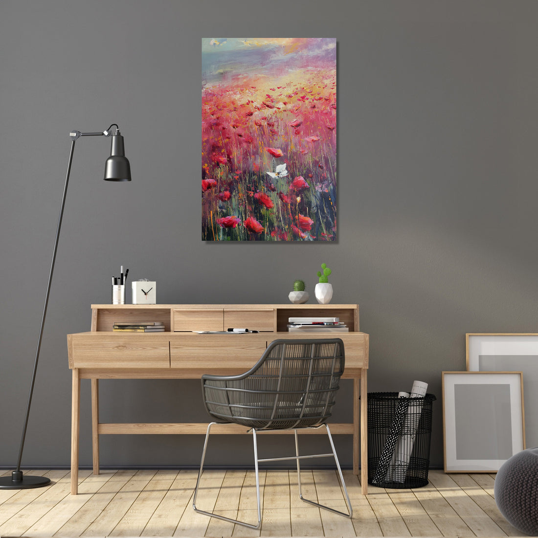 This impressionistic artwork beautifully portrays a poppy field with the symbolic presence of the Yorkshire white rose, brought to life with visible brush strokes that capture a warm, melancholic light. The vivid reds of the poppies contrast gently with the serene white blooms, creating a harmonious and contemplative piece. Ideal for both home and office spaces, this painting adds a touch of elegance and depth, evoking a soothing yet emotionally rich ambience that enhances any decor.
